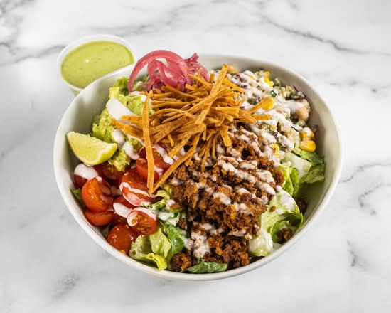 romaine. cherry tomatoes. white bean quinoa. pickled onion. avocado. spicy maple seitan. crispy tortilla strips. agave lime dressing. coconut lime drizzle. side of supergreen goddess. 44 grams of protein. (contains gluten)
