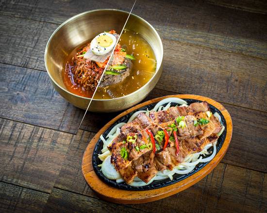 Buckwheat Cold Noodles and Marinated Pork (비빔/물)냉면 & 직화 삼겹살 구이