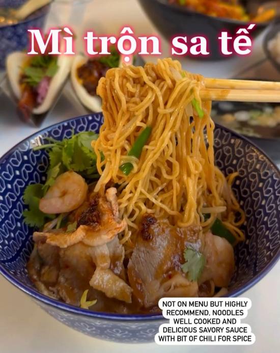 Indulge in a tantalizing blend of flavors with Mi Tron Sate! This dish combines chewy noodles with a spicy sate sauce, creating a savory sensation that will leave your taste buds tingling with delight.