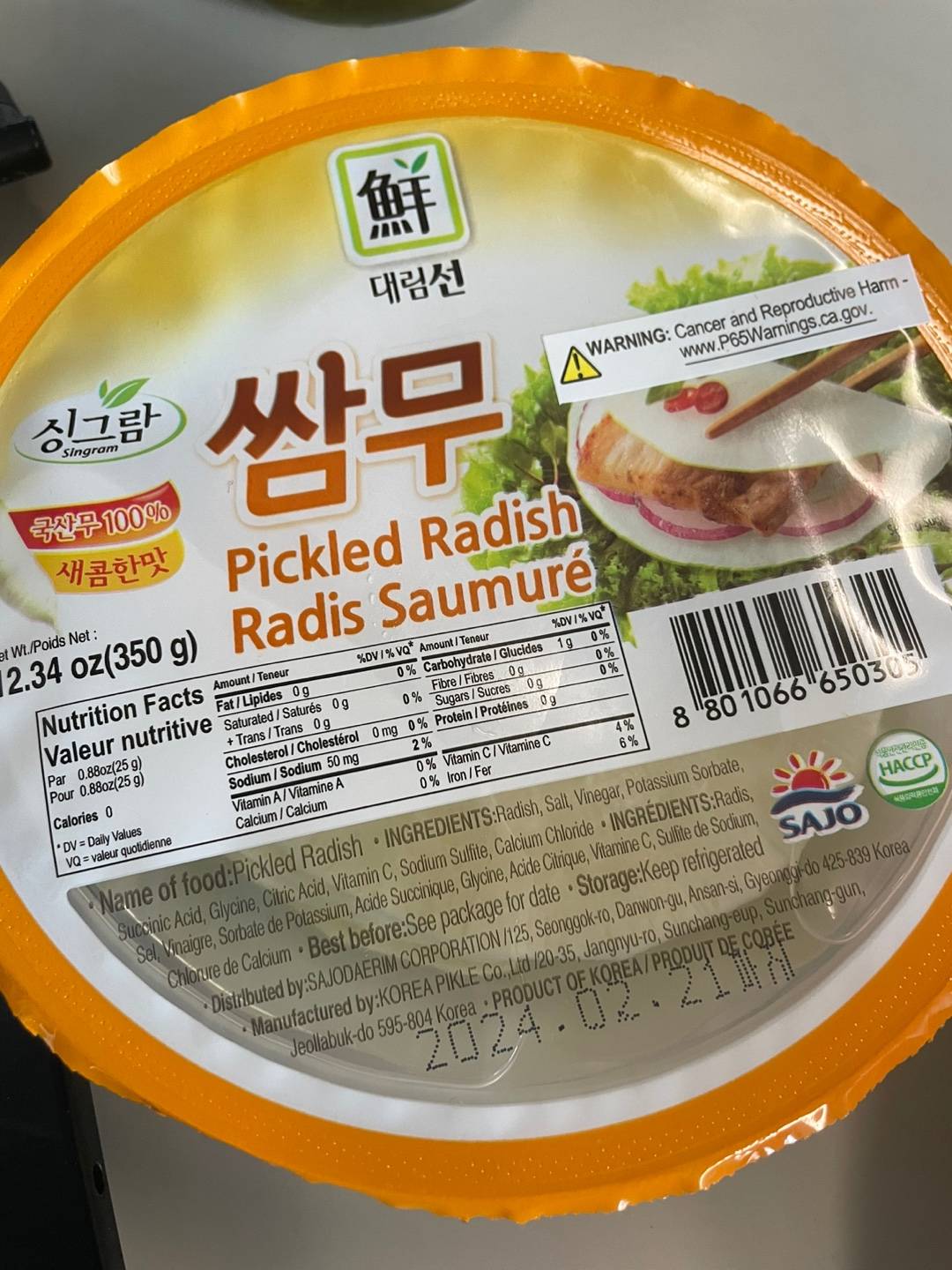 pickled thinly-sliced radish to wrap Meat, such as Sam-kyub sal (pork belly)or bulgogi