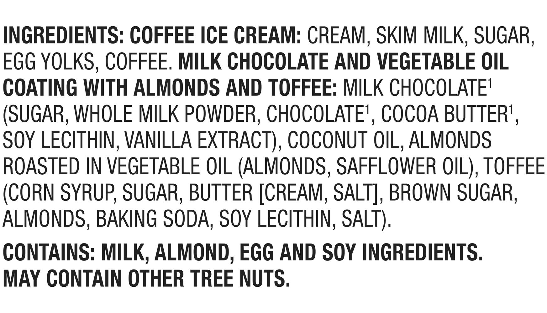 Ingredients: COFFEE ICE CREAM: CREAM, SKIM MILK, SUGAR, EGG YOLKS, COFFEE. MILK CHOCOLATE AND VEGETABLE OIL COATING WITH ALMONDS AND TOFFEE: MILK CHOCOLATE (SUGAR, WHOLE MILK POWDER, CHOCOLATE, COCOA BUTTER, SOY LECITHIN, VANILLA EXTRACT), COCONUT OIL, ALMONDS ROASTED IN VEGETABLE OIL (ALMONDS, SAFFLOWER OIL), TOFFEE (CORN SYRUP, SUGAR, BUTTER [CREAM, SALT], BROWN SUGAR, ALMONDS, BAKING SODA, SOY LECITHIN, SALT), . Contains: MILK, ALMOND, EGG AND SOY INGREDIENTS.