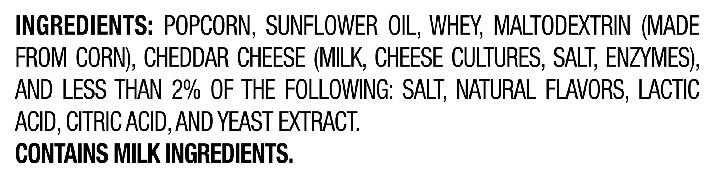 Ingredients: Popcorn, Sunflower Oil, Whey, Maltodextrin (Made from Corn), Cheddar Cheese (Milk Cheese Cultures Salt Enzymes), and Less than 2% of the Following Salt, Natural Flavors, Lactic Acid, Citric Acid, and Yeast Extract Contains: Milk, Corn