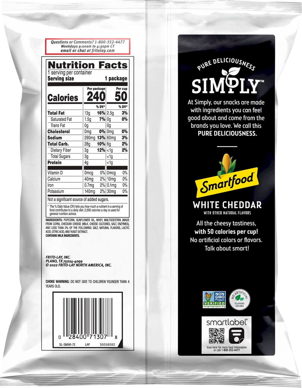 With other natural flavors. No artificial flavors, colors. 50 calories per cup. See nutrition information for total fat content. Non-GMO Project verified. nongmoproject.org. Pure deliciousness. At simply, our snacks are made with ingredients you can feel good about and come from the brands you love. We call this pure deliciousness. White cheddar with other natural flavors. All the cheesy tastiness, with 50 calories per cup! No artificial colors or flavors. Flavor: White cheddar