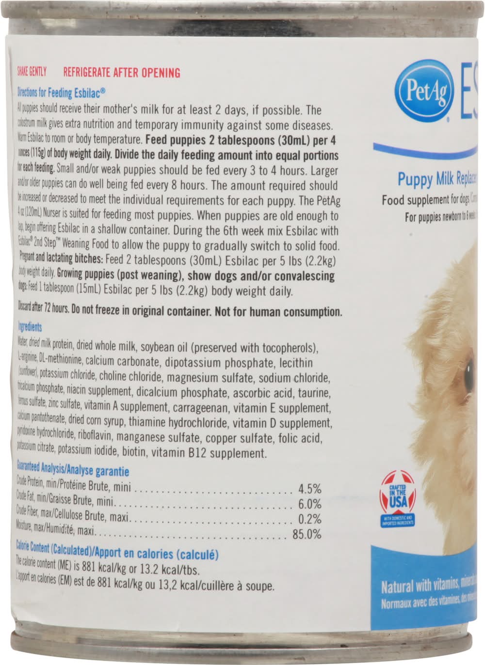 Directions for use: Shake gently. Directions for Feeding Esbilac: All puppies should receive their mother's milk for at least 2 days, if possible. The colostrum milk gives extra nutrition and temporary immunity against some diseases. Esbilac to room or body temperature. Feed puppies 2 tablespoons (30 ml) per 4 ounces (115 g) of body weight daily. Divide the daily feeding amount into equal portions for each feeding. Small and/or weak puppies should be fed every 3 to 4 hours. Larger and/or older Puppies can do well being fed every 8 hours. The amount required should be increased or decreased to meet the individual requirements for each Puppy. The PetAg 4 oz (120 ml) Nurser is suited for feeding most puppies. When puppies are old enough to lap, begin offering Esbilac in a shallow container. During the 6th week mix Esbilac with Esbilac 2nd Step Weaning Food to allow the puppy to gradually switch to solid food. Pregnant and Lactating bitches: Feed 2 tablespoons (30 ml) Esbilac per 5 lbs (2.2 kg) body weight daily. Growing puppies (Post Weaning), Show dogs and/or Convalescing dogs: Feed 1 tablespoon (15 ml) Esbilac per 5 lbs (2.2 kg) body weight daily. Refrigerate after opening. Discard after 72 hours. Do not freeze in original container. Use before date stamped on can. Storage recommendation: Refrigerate after opening. Discard after 72 hours. Do not freeze in original container.