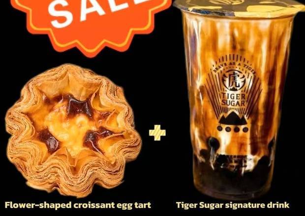 Black Sugar Boba Milk W. Cream Mousse + Flower-Shaped Croissant Egg Tart (1 Pc) 虎虎生风厚有机鲜奶 + 千层花边可颂蛋挞 (1 Pc)