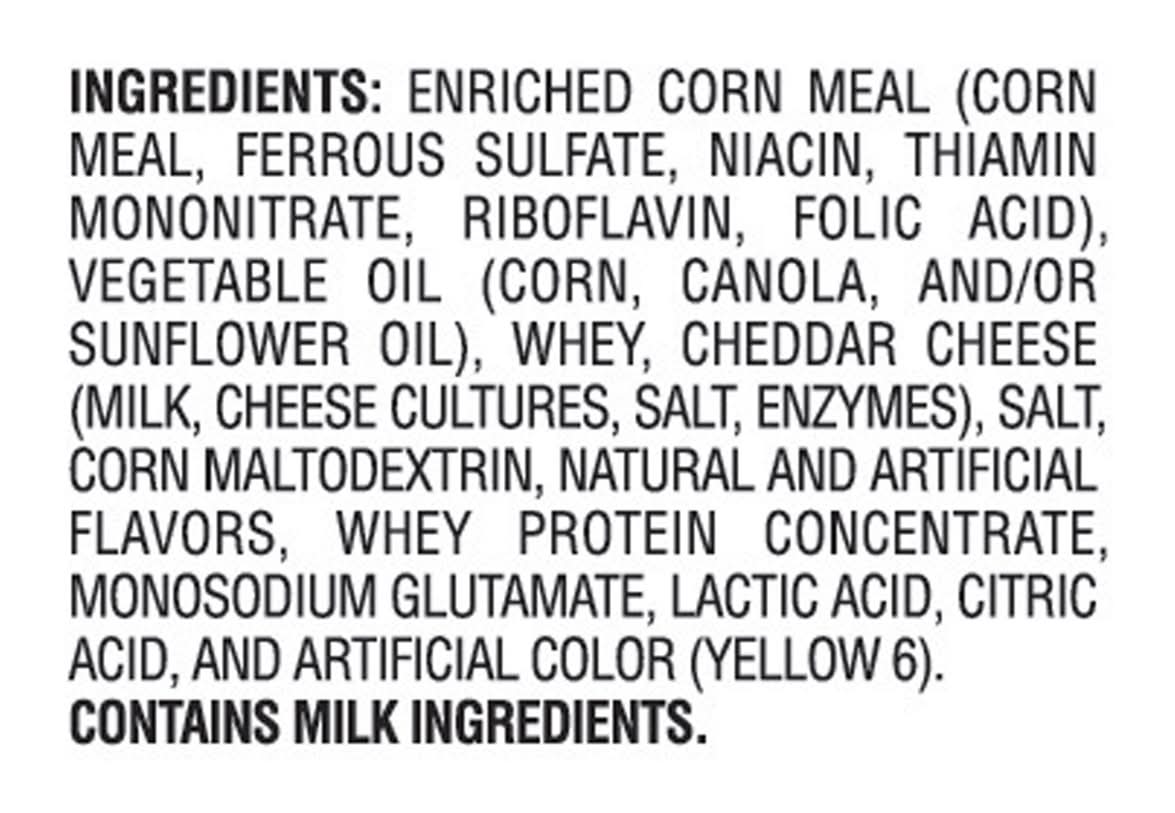 Ingredients: Enriched Corn Meal (Corn Meal, Ferrous Sulfate, Niacin, Thiamin Mononitrate, Riboflavin, Folic Acid), Vegetable Oil (Corn, Canola, and/or Sunflower Oil), Whey, Cheddar Cheese (Milk, Cheese Cultures, Salt, Enzymes), Salt, Corn Maltodextrin, Natural and Artificial Flavors, Whey Protein Concentrate, Monosodium Glutamate, Lactic Acid, Citric Acid, and Artificial Color (Yellow 6) Contains: Milk