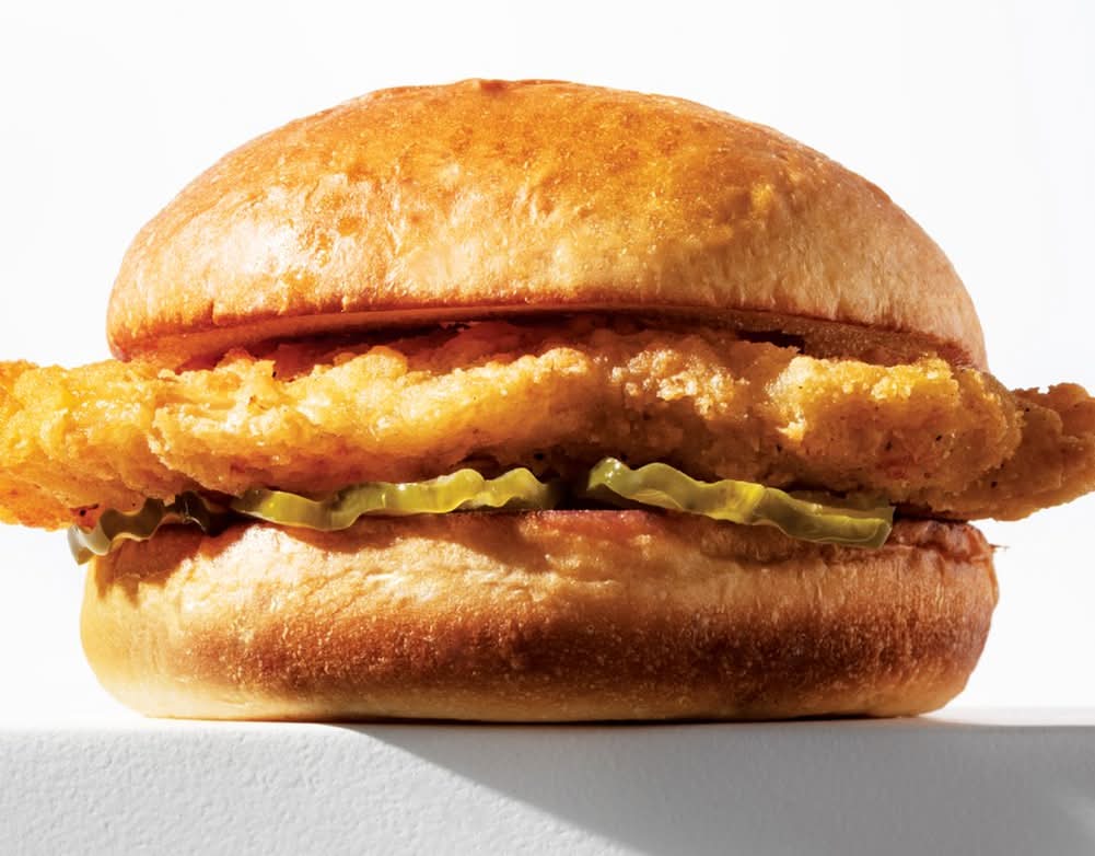 Crispy Chicken Tenders topped with pickles served in a fluffy sandwich bun.