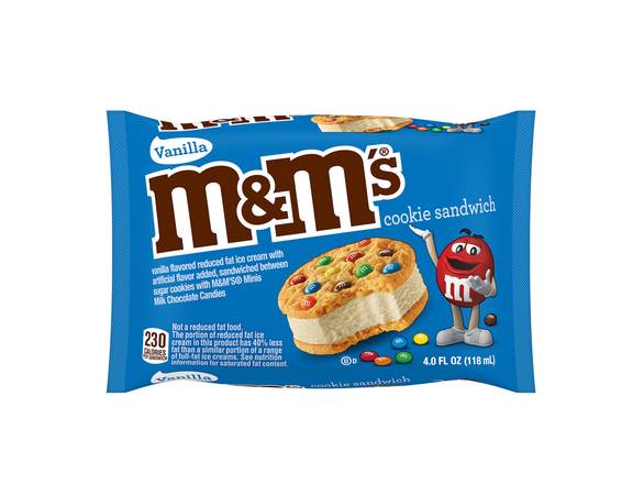 Treat yourself to a cool and colorful ice-cream sandwich. Velvety vanilla ice cream between two sugar cookies, covered in classic M&M’s.