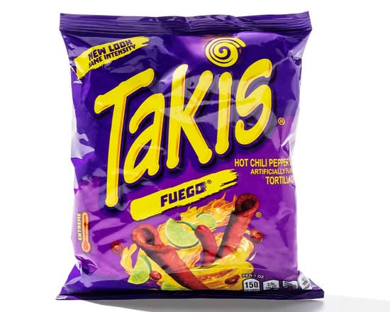 Take your tongue on a nice long firewalk with Takis Fuego hot chili pepper and lime rolled tortilla chips. Rated: Extreme.