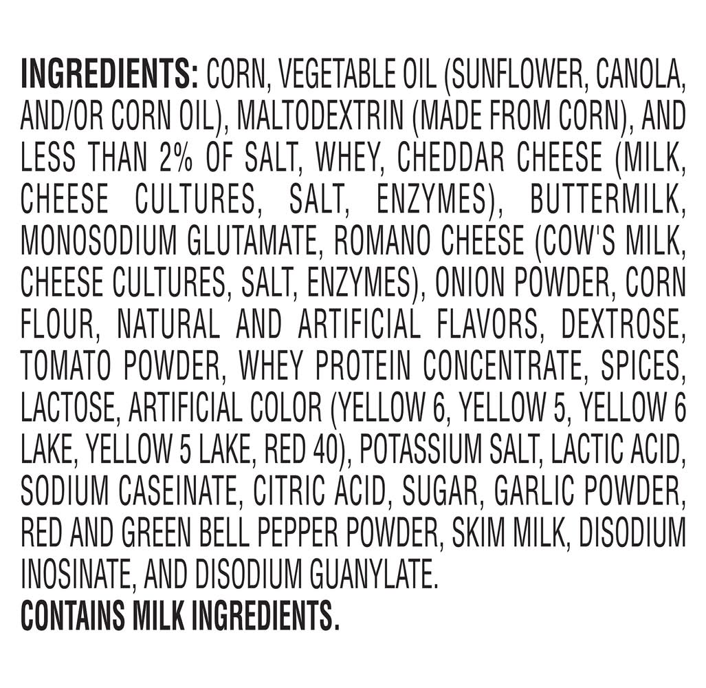 Ingredients: Corn, Vegetable Oil (Sunflower, Canola and/or Corn Oil), Maltodextrin (Made from Corn), and Less than 2% of Salt, Whey, Cheddar Cheese (Milk, Cheese Cultures, Salt, Enzymes), Buttermilk, Monosodium Glutamate, Romano Cheese (Cow's Milk, Cheese Cultures, Salt, Enzymes), Onion Powder, Corn Flour, Natural and Artificial Flavors, Dextrose, Tomato Powder, Whey Protein Concentrate, Spices, Lactose, Artificial Color (Yellow 6, Yellow 5, Yellow 6 Lake, Yellow 5 Lake, Red 40), Potassium Salt, Lactic Acid, Sodium Caseinate, Citric Acid, Sugar, Garlic Powder, Red and Green Bell Pepper Powder, Skim Milk, Disodium Inosinate, and Disodium Guanylate Contains: Milk, Corn, Lactose