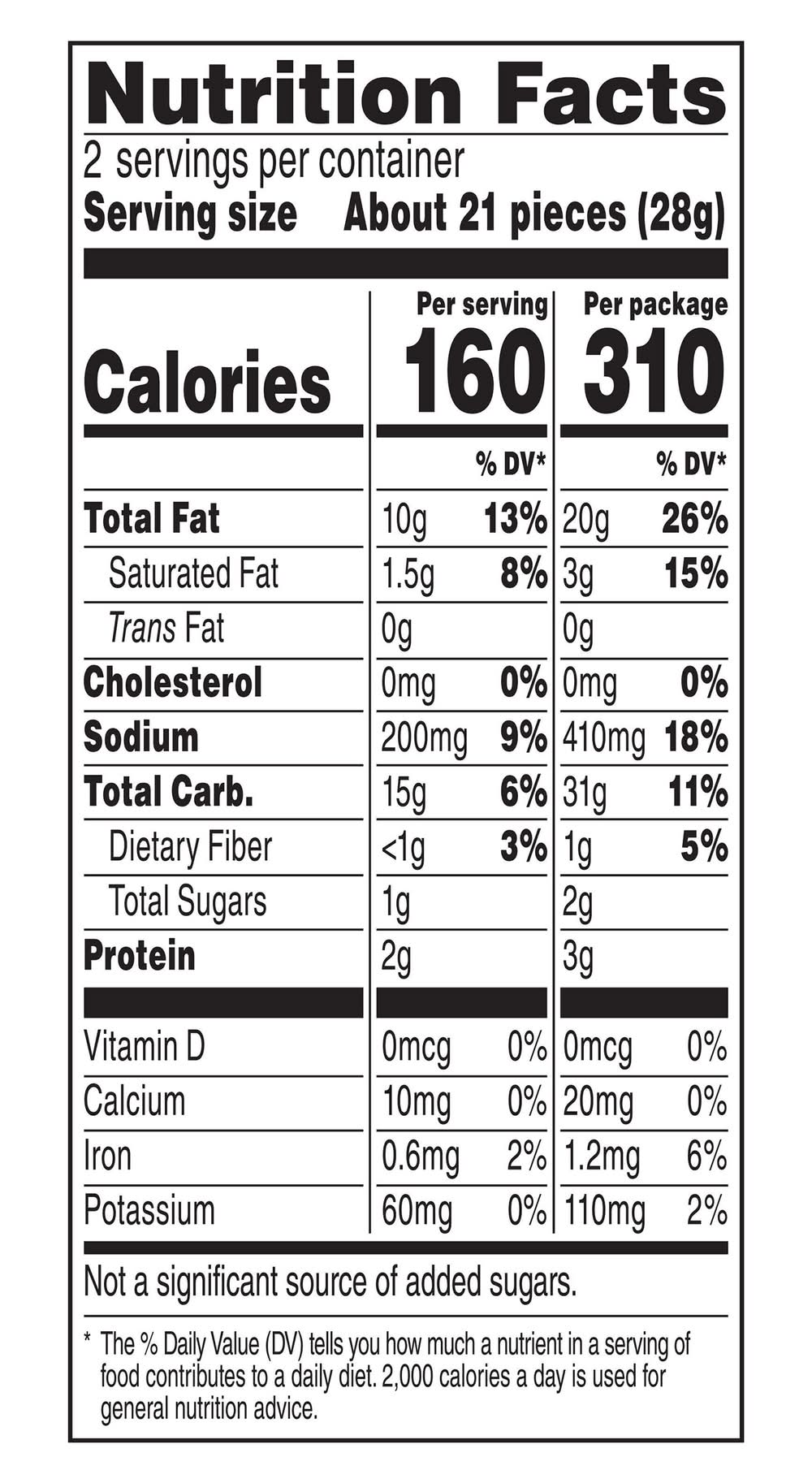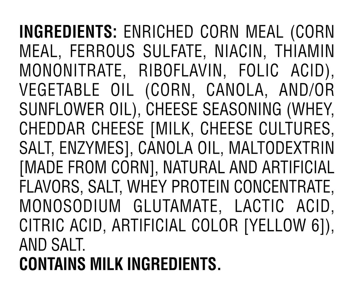 Ingredients: Enriched Corn Meal (Corn Meal, Ferrous Sulfate, Niacin, Thiamin Mononitrate, Riboflavin, Folic Acid), Vegetable Oil (Corn, Canola, and/or Sunflower Oil), Whey, Cheddar Cheese (Milk, Cheese Cultures, Salt, Enzymes), Salt, Corn Maltodextrin, Natural and Artificial Flavors, Whey Protein Concentrate, Monosodium Glutamate, Lactic Acid, Citric Acid, and Artificial Color (Yellow 6) Contains: Milk