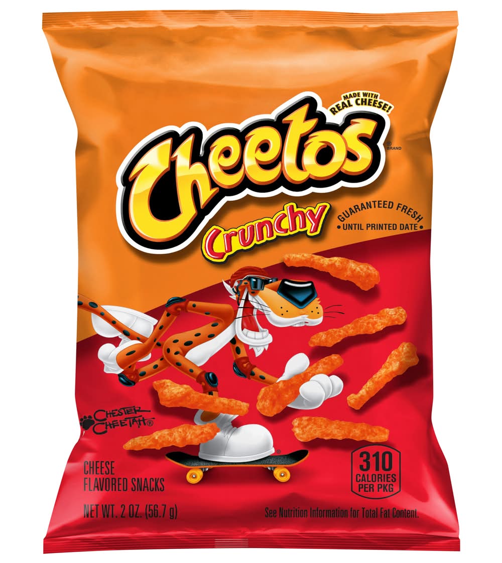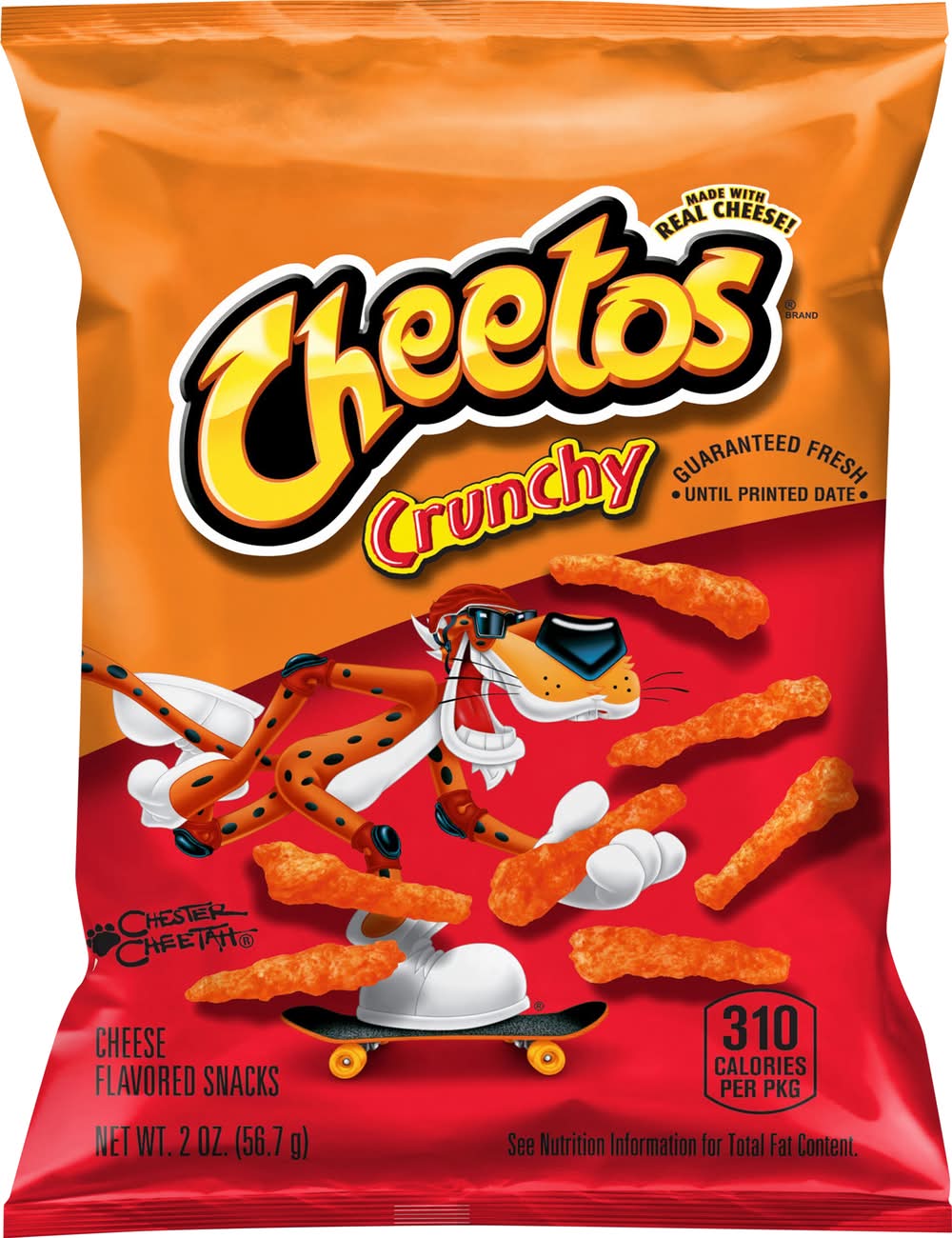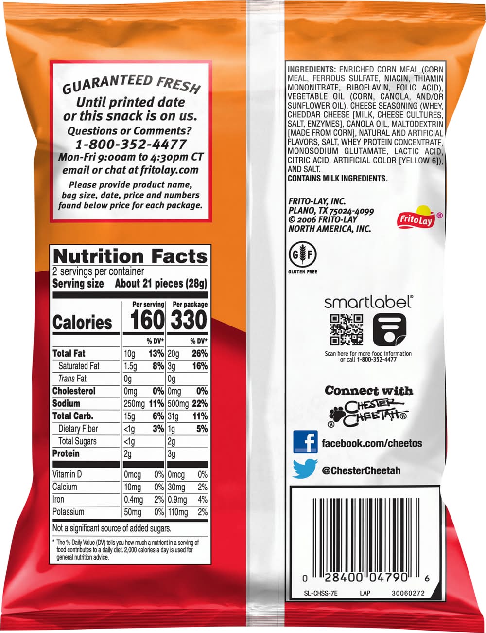 Cheetos snacks are the much-loved cheesy treats that are fun for everyone! You just can't eat a Cheetos snack without licking the "cheetle" off your fingertips. And wherever the Cheetos brand and Chester Cheetah go, cheesy smiles are sure to follow. • Brand: Cheetos • Flavor: Cheese • gluten-free • Frito-Lay, Inc., Plano, TX, 75024-4099, Ph: 800-352-4477