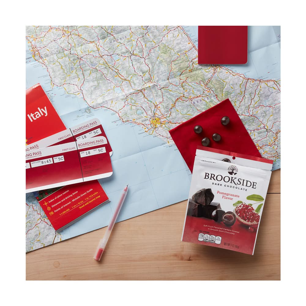 Soft fruit flavored centers covered in smooth dark chocolate. Per Serving: 170 calories; 4.5 g sat fat (24% DV); 60 mg sodium (30% DV); 24 g sugars. Resealable. Taste the many sides of Brookside. Exotic pomegranate flavor inside, smooth, dark chocolate outside. There's something for all your sides. Gluten free. No artificial flavors. No artificial colors. Flavor: Pomegranate