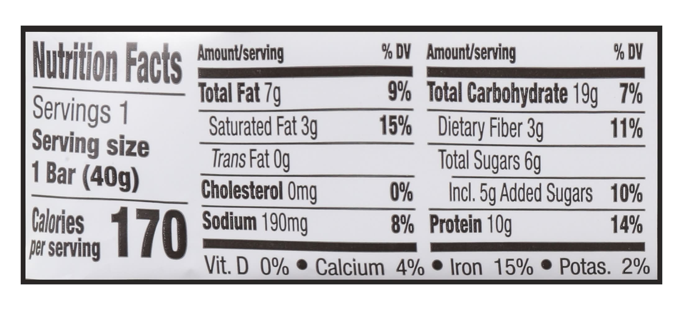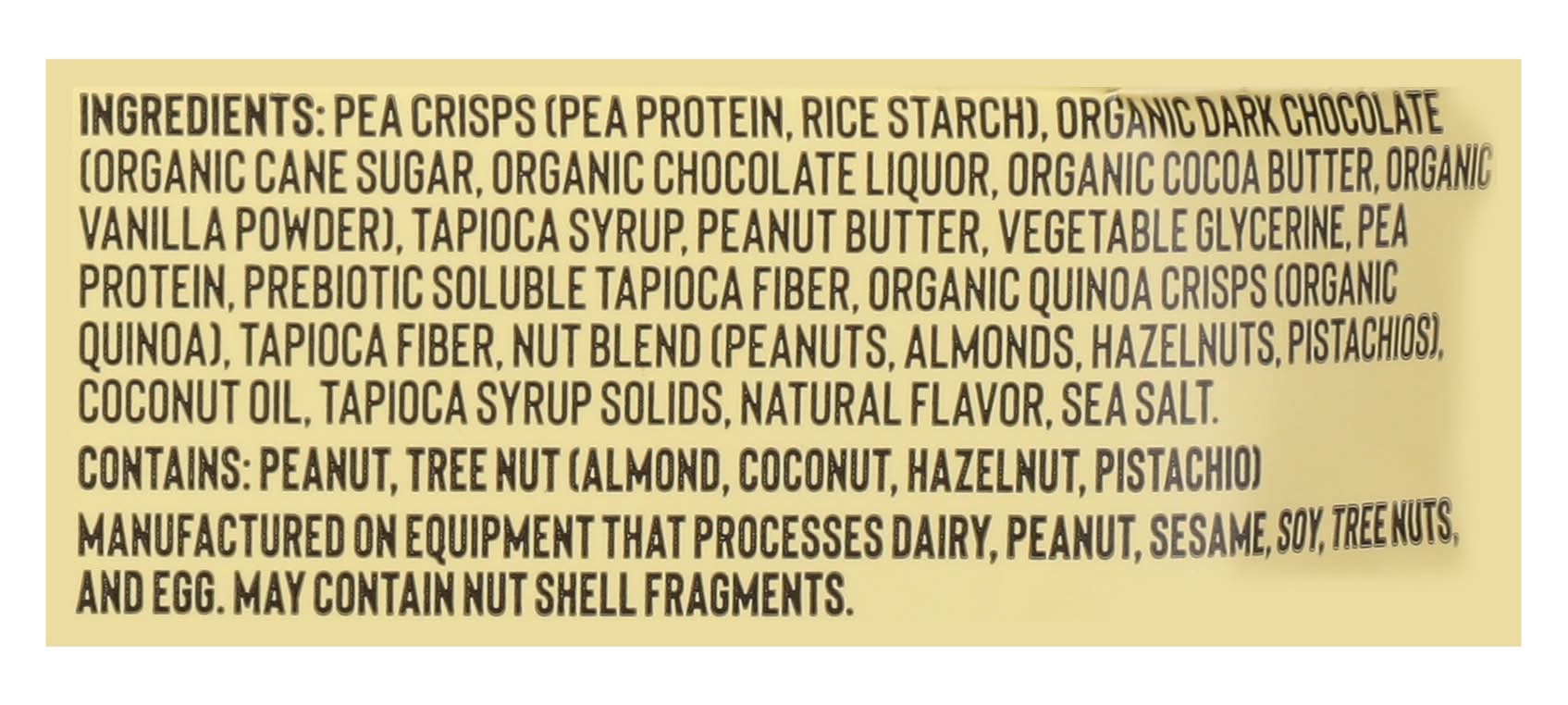 Ingredients: Pea Protein Crisps (Pea Protein, Rice Starch) Organic Tapioca Syrup Organic Dark Chocolate (Organic Cane Sugar, Organic Chocolate Liquor, Organic Cocoa Butter, Organic Vanilla Powder) Peanut Butter Vegetable Glycerine Prebiotic Soluble Tapioca Fiber Organic Quinoa Crisps (Organic Quinoa) Pea Protein Organic Tapioca Syrup Solids Peanuts Tapioca Fiber Natural Flavor Sea Salt Sunflower Lecithin. Contains: Peanuts, Milk, Soybeans, Tree Nuts, Eggs