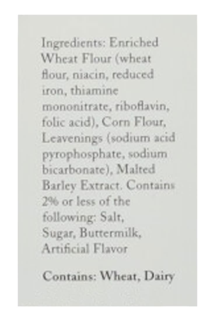 Ingredients: Enriched Wheat Flour (Wheat Flour, Niacin, Reduced Iron, Thiamine Mononitrate, Riboflavin, Folic Acid), Corn Flour, Leavenings (Sodium Acid Pyrophosphate, Sodium Bicarbonate), Malted Barley Extract, Contains 2% or Less of the Following: Salt, Sugar, Buttermilk, Artificial Flavor Contains: Wheat, Corn, Barley, Milk