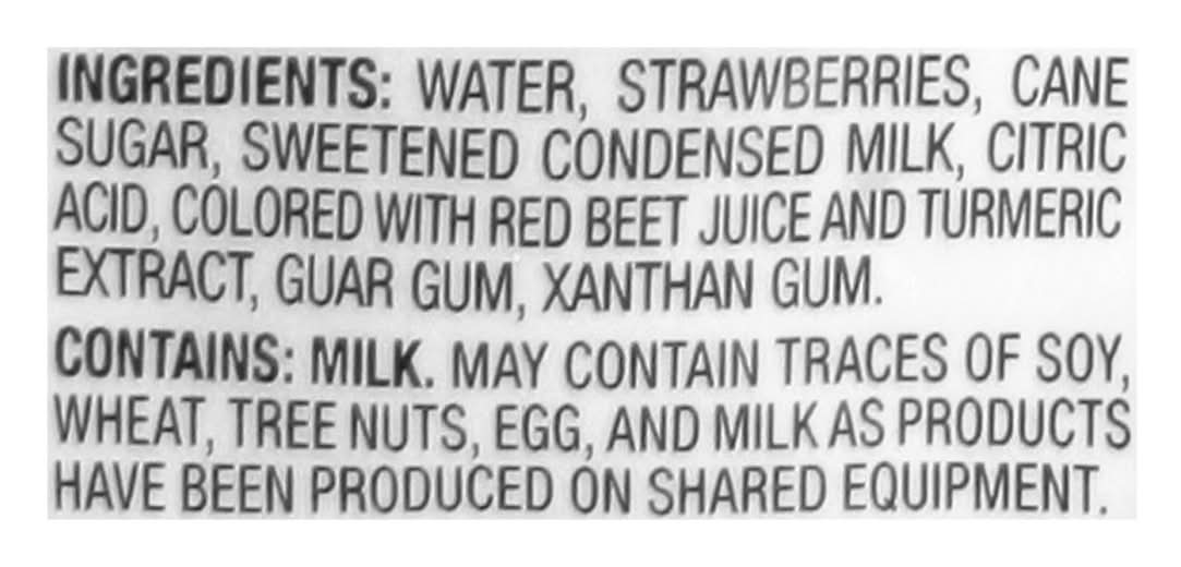 Ingredients: Water, Strawberries, Cane Sugar, Sweetened Condensed Milk, Citric Acid, Colored with Red Beet Juice and Turmeric Extract, Guar Gum, Xanthan Gum Contains: Milk, Soybeans, Wheat, Tree Nuts, Eggs, Milk