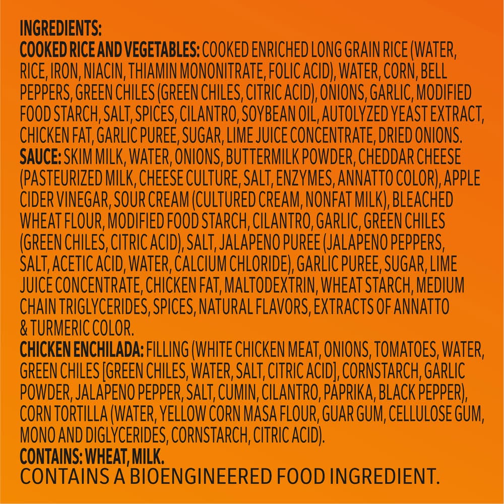 Ingredients: COOKED RICE AND VEGETABLES: COOKED ENRICHED LONG GRAIN RICE (WATER, RICE, IRON, NIACIN, THIAMIN MONONITRATE, FOLIC ACID), WATER, CORN, BELL PEPPERS, GREEN CHILES (GREEN CHILES, CITRIC ACID), ONIONS, GARLIC, MODIFIED FOOD STARCH, SALT, SPICES, CILANTRO, SOYBEAN OIL, AUTOLYZED YEAST EXTRACT, CHICKEN FAT, GARLIC PUREE, SUGAR, LIME JUICE CONCENTRATE, DRIED ONIONS. SAUCE: SKIM MILK, WATER, ONIONS, BUTTERMILK POWDER, CHEDDAR CHEESE (PASTEURIZED MILK, CHEESE CULTURE, SALT, ENZYMES, ANNATTO COLOR), APPLE CIDER VINEGAR, SOUR CREAM (CULTURED CREAM, NONFAT MILK), BLEACHED WHEAT FLOUR, MODIFIED FOOD STARCH, CILANTRO, GARLIC, GREEN CHILES (GREEN CHILES, CITRIC ACID), SALT, JALAPENO PUREE (JALAPENO PEPPERS, SALT, ACETIC ACID, WATER, CALCIUM CHLORIDE), GARLIC PUREE, SUGAR, LIME JUICE CONCENTRATE, CHICKEN FAT, MALTODEXTRIN, WHEAT STARCH, MEDIUM CHAIN TRIGLYCERIDES, SPICES, NATURAL FLAVORS, EXTRACTS OF ANNATTO TURMERIC COLOR. CHICKEN ENCHILADA: FILLING (WHITE CHICKEN MEAT, ONIONS, TOMATOES, WATER, GREEN CHILES [GREEN CHILES, WATER, SALT, CITRIC ACID], CORNSTARCH, GARLIC POWDER, JALAPENO PEPPER, SALT, CUMIN, CILANTRO, PAPRIKA, BLACK PEPPER), CORN TORTILLA (WATER, YELLOW CORN MASA FLOUR, GUAR GUM, CELLULOSE GUM, MONO AND DIGLYCERIDES, CORNSTARCH, CITRIC ACID), . Contains: CONTAINS: WHEAT, MILK.