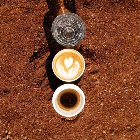 Split the double shot into two single shots, serve one as just espresso, serve the other as a cortado. Intended to taste the coffee with and without milk at its fullest potential.
