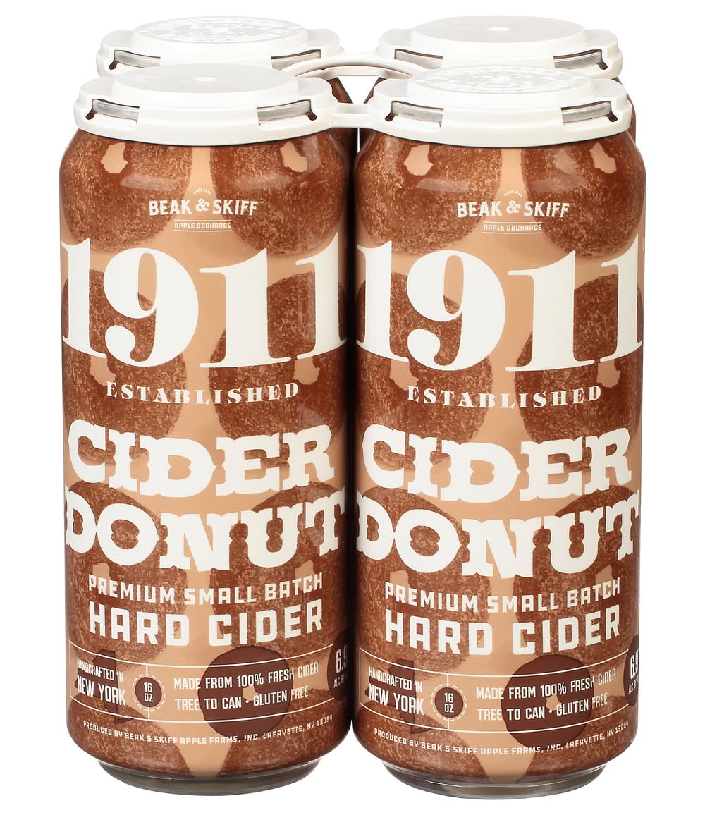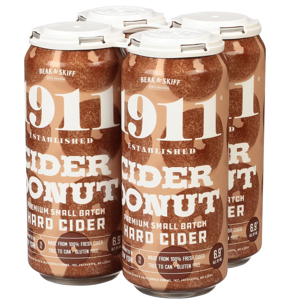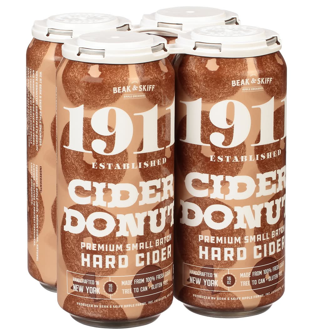 Premium small batch hard cider. Made from 100% fresh apples. Gluten free. Built on Beak & Skiff Apple Orchards' 100-year history of quality and innovation, 1911 Established is committed to producing exceptional products with only the freshest ingredients. This make for a hard cider that is not only superior in taste, but one that is also naturally lower in sugar and carbohydrates than many of the leading national hard cider brands. From tree to can, our process is handled in-house to provide small batch, handcrafted hard cider for our consumers. 1911 Cranberry Cider Donut Hard Cider is blended with brown sugar and spices to create the warm, toasty perfectly fall flavor of this favorite sweet treat. 6.9% ABV. Handcrafted in New York. Produced by Beak & Skiff Apple Farms, Inc., Lafayette, NY 13084. • Brand: 1911 established • Pack size: 4 • gluten-free • Alcohol by volume: 6.9% • Tasting notes: cinnamon, crisp, fresh, sweet, vanilla