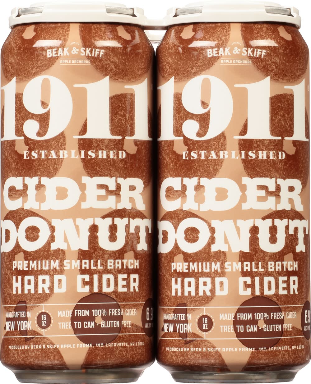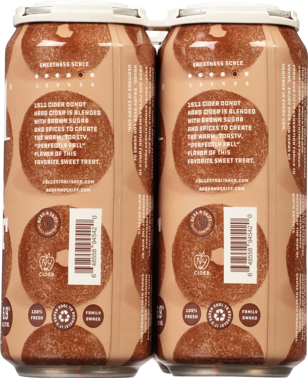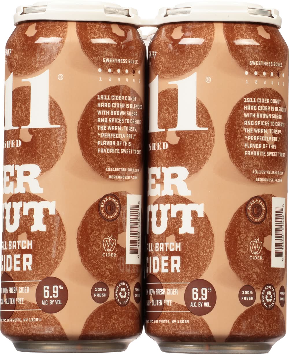 Premium small batch hard cider. Made from 100% fresh apples. Gluten free. Built on Beak & Skiff Apple Orchards' 100-year history of quality and innovation, 1911 Established is committed to producing exceptional products with only the freshest ingredients. This make for a hard cider that is not only superior in taste, but one that is also naturally lower in sugar and carbohydrates than many of the leading national hard cider brands. From tree to can, our process is handled in-house to provide small batch, handcrafted hard cider for our consumers. 1911 Cranberry Cider Donut Hard Cider is blended with brown sugar and spices to create the warm, toasty perfectly fall flavor of this favorite sweet treat. 6.9% ABV. Handcrafted in New York. Produced by Beak & Skiff Apple Farms, Inc., Lafayette, NY 13084. • Brand: 1911 established • Pack size: 4 • gluten-free • Alcohol by volume: 6.9% • Tasting notes: cinnamon, crisp, fresh, sweet, vanilla