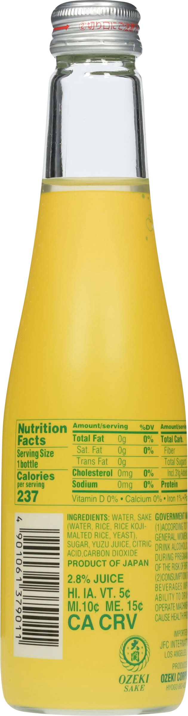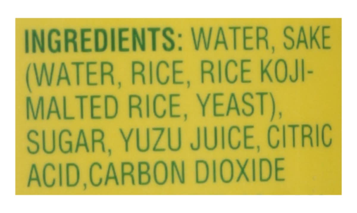 Ingredients: Water, Sake (Water, Rice, Rice Koji-Malted Rice, Yeast), Sugar, Yuzu Juice, Citric Acid, Carbon Dioxide