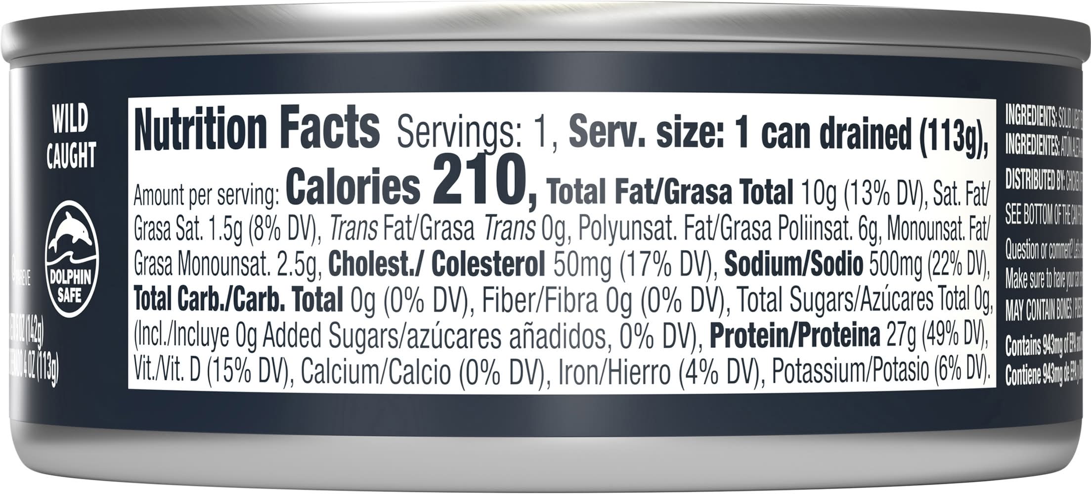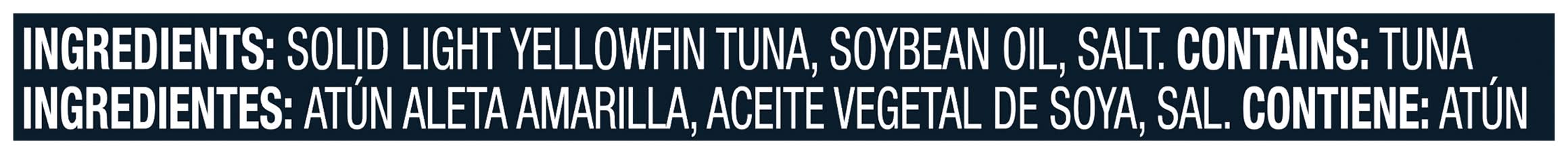 Ingredients: Solid Light Yellowfin Tuna, Soybean Oil, Salt Contains: Fish, Tuna, Soybeans