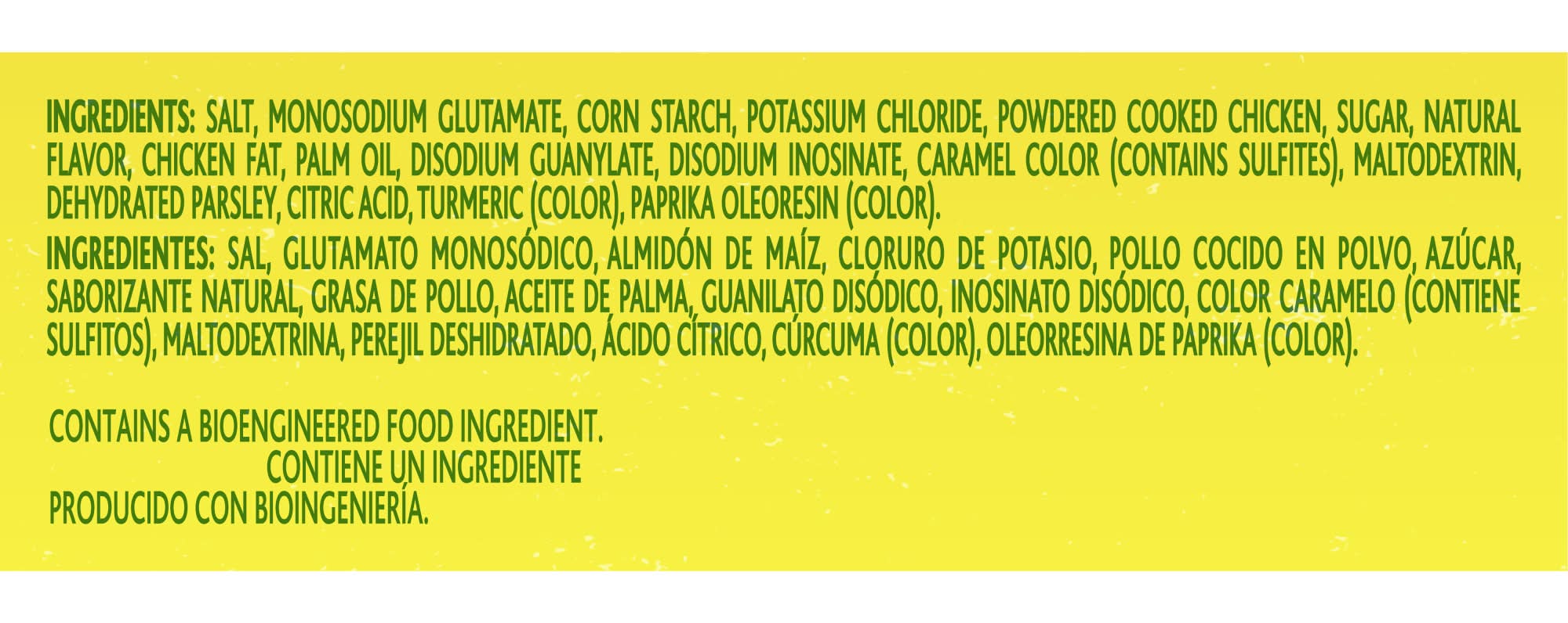 Ingredients: Salt, Sugar, Monosodium Glutamate Corn Starch, Beef Fat, Hydrolyzed Corn Protein, Dried Chicken Meat, Autolyzed Yeast Extract Barley, Chicken Fat Adds a Dietarily Insignificant Amount of Fat and Cholesterol, Natural Flavor, Maltodextrin, Silicon Dioxide Prevents Caking, Dehydrated Parsley, Disodium Inosinate, Citric Acid Yellow 5, Annatto Color, Yellow 6.