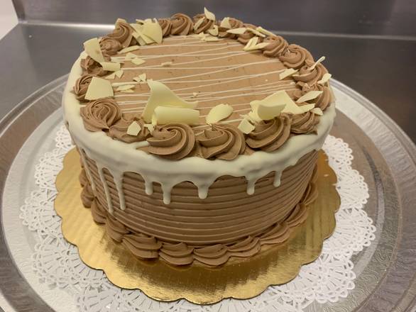 Vanilla cake with hazelnut chocolate frosting, Nutella frosting topped with white chocolate shavings.