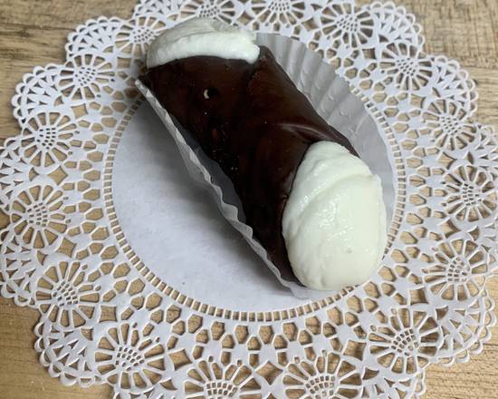 Chocolate covered cannoli shell filled with ricotta cream.