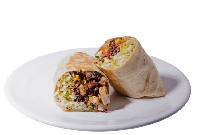 Purple rice, napa/romaine blend, corn, black beans, cheddar cheese, pico, bbq chicken, herb ranch dressing, tortilla strips, cilantro, basil. (dairy, soy)