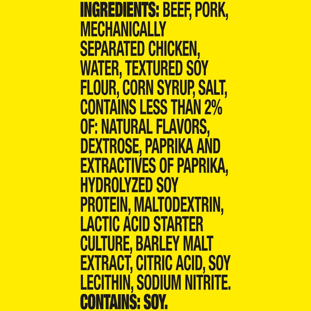 Ingredients: Beef, Pork, Mechanically Separated Chicken, Water, Textured Soy Flour, Corn Syrup, Salt, Contains less than 2% of: Natural Flavors, Dextrose, Paprika and Extractives of Paprika, Hydrolyzed Soy Protein, Maltodextrin, Lactic Acid Starter Culture, Barley Malt Extract, Citric Acid, Soy Lecithin, Sodium Nitrite. CONTAINS: SOY. Contains: Mustard (Canada and EU), Soy