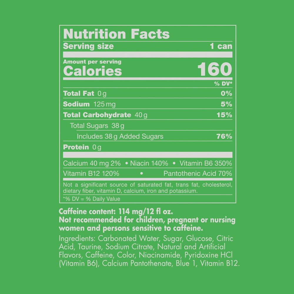 Ingredients: Carbonated Water, Sugar, Glucose, Citric Acid, Taurine, Sodium Citrate, Natural and Artificial Flavors, Caffeine, Color, Niacinamide, Pyridoxine Hcl (Vitamin B6), Calcium Pantothenate, Blue 1, Vitamin B12