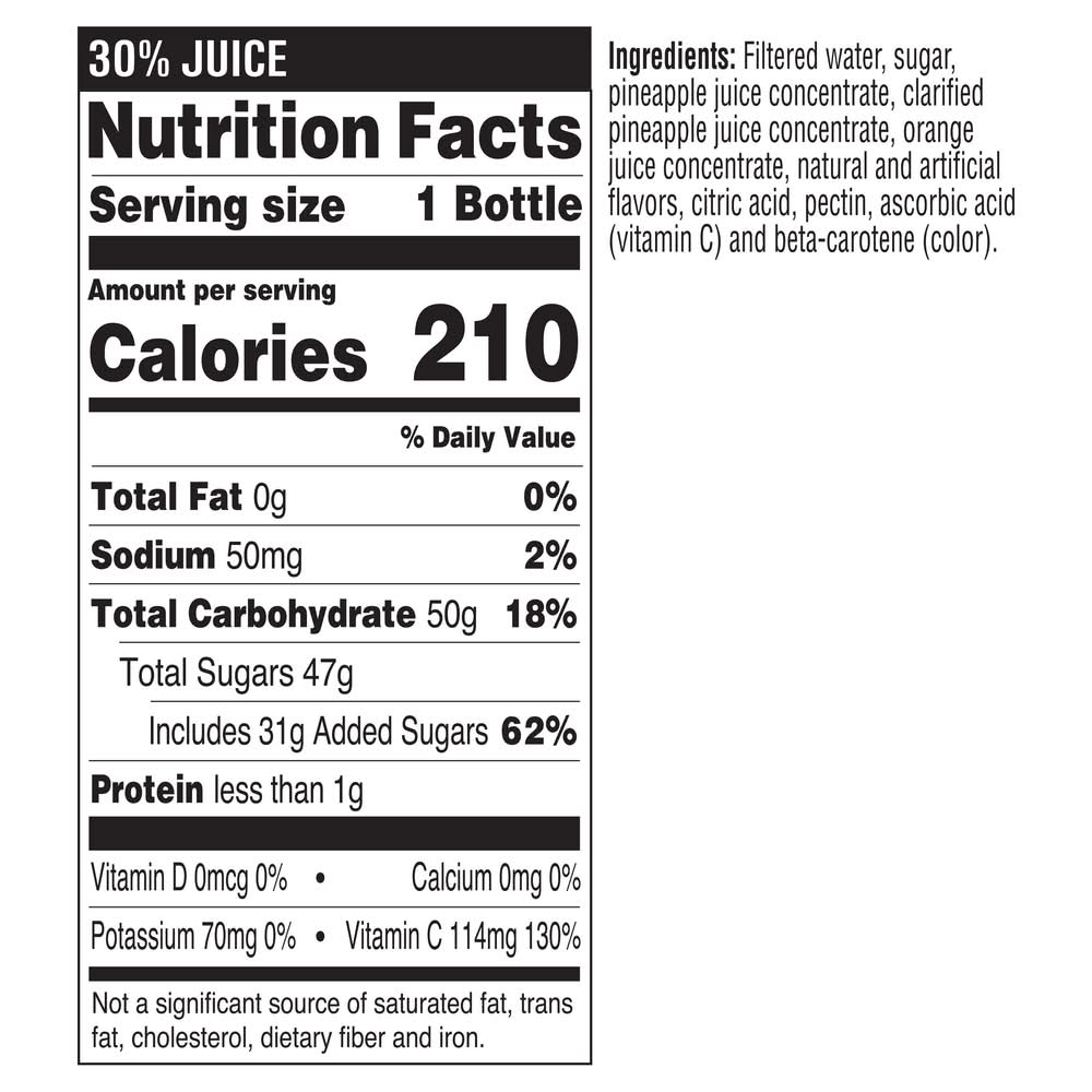 Ingredients: FILTERED WATER, SUGAR, PINEAPPLE JUICE CONCENTRATE, CLARIFIED PINEAPPLE JUICE CONCENTRATE, ORANGE JUICE CONCENTRATE, NATURAL AND ARTIFICIAL FLAVORS, CITRIC ACID, PECTIN, ASCORBIC ACID (VITAMIN C), AND BETA-CAROTENE (COLOR), .