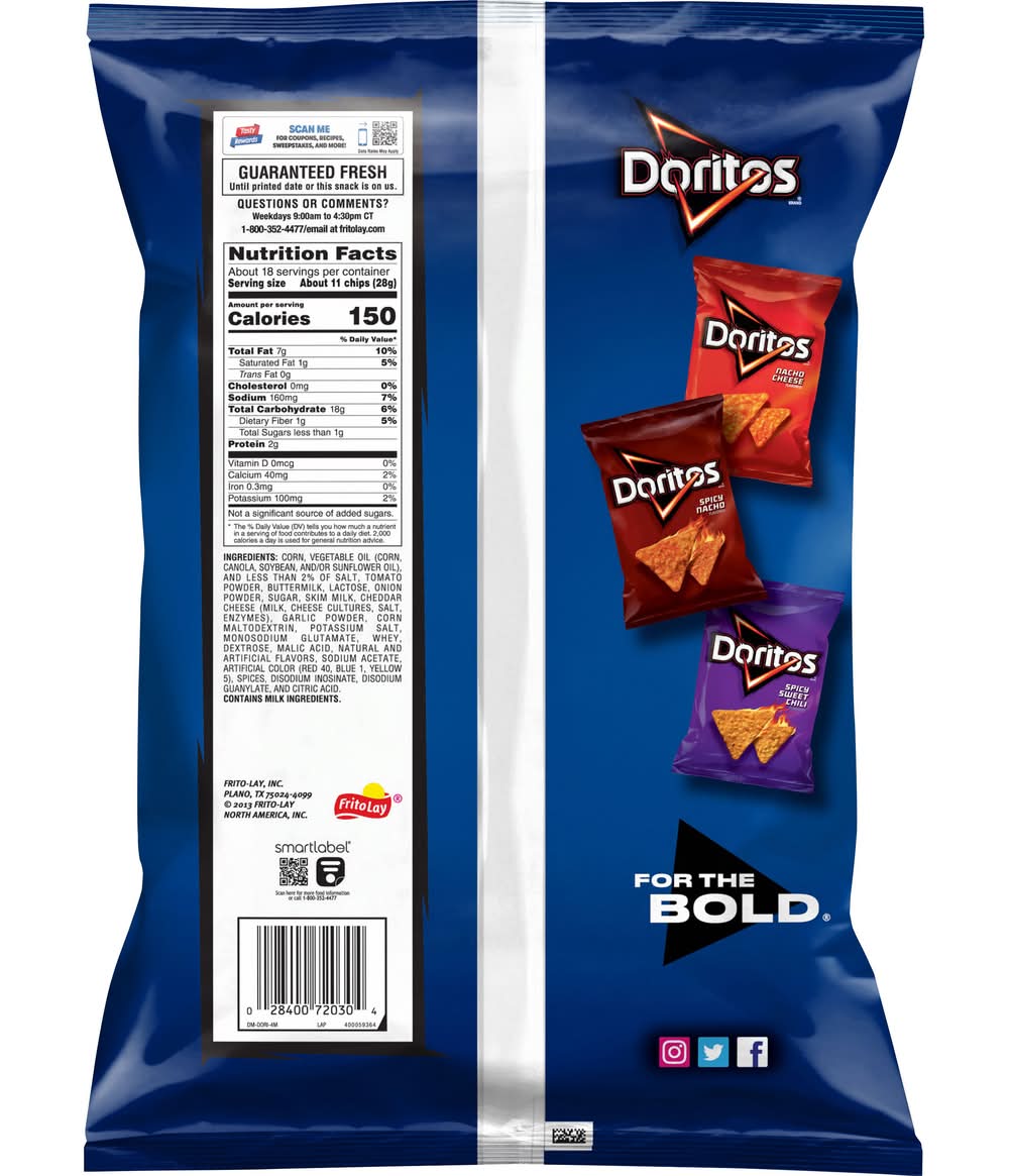 Mix and match. Guaranteed fresh until printed date. Guaranteed fresh until printed date or this snack is on us. Flavor on another level. Doritos nacho cheese. Doritos flamin hot nacho Flavor: Cool ranch