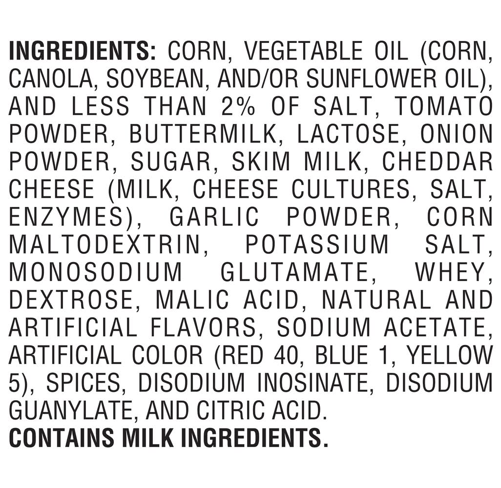 Ingredients: Corn, Vegetable Oil (Corn, Canola, Soybean, And/Or Sunflower Oil), And Less Than 2% Of Salt, Tomato Powder, Buttermilk, Lactose, Onion Powder, Sugar, Skim Milk, Cheddar Cheese (Milk, Cheese Cultures, Salt, Enzymes), Garlic Powder, Corn Maltodextrin, Potassium Salt, Monosodium Glutamate, Whey, Dextrose, Malic Acid, Natural And Artificial Flavors, Sodium Acetate, Artificial Color (Red 40, Blue 1, Yellow 5), Spices, Disodium Inosinate, Disodium Guanylate, And Citric Acid. CONTAINS MILK INGREDIENTS. Contains: CONTAINS MILK INGREDIENTS.