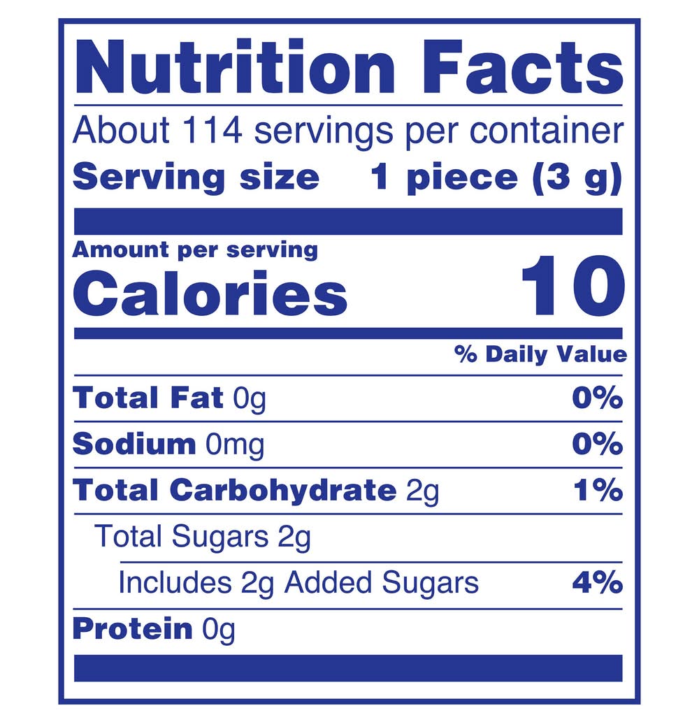 Ingredients: SUGAR, GUM BASE, CORN SYRUP, GLYCEROL, CITRIC ACID; LESS THAN 2% OF: CORN STARCH, NATURAL AND ARTIFICIAL FLAVORS, SOY LECITHIN, MALIC ACID, ACESULFAME K, ASPARTAME, COLOR (BLUE 1 LAKE), BHT (TO MAINTAIN FRESHNESS). Contains: 'Contains Soybeans'