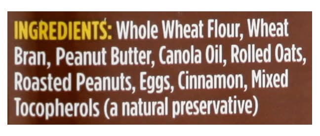Ingredients: Whole Wheat Flour, Wheat Bran, Peanut Butter, Canola Oil, Rolled Oats, Roasted Peanuts, Eggs, Cinnamon, Mixed Tocopherols (a Natural Preservative)