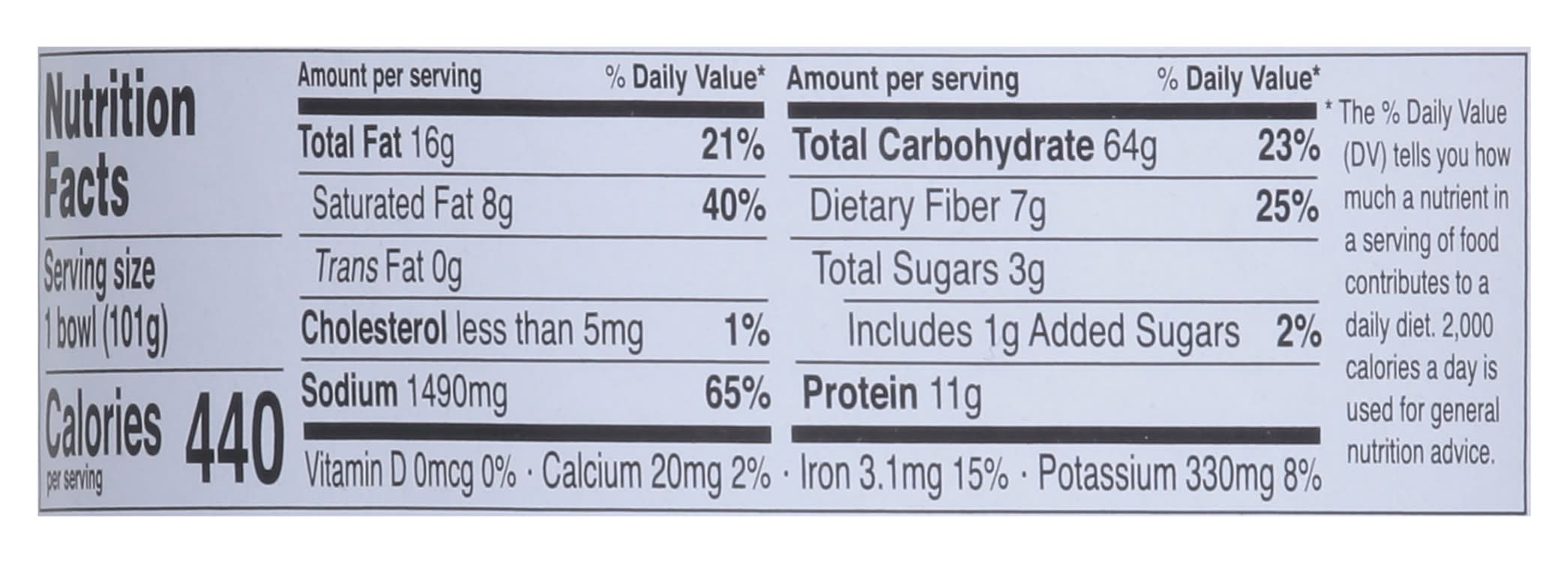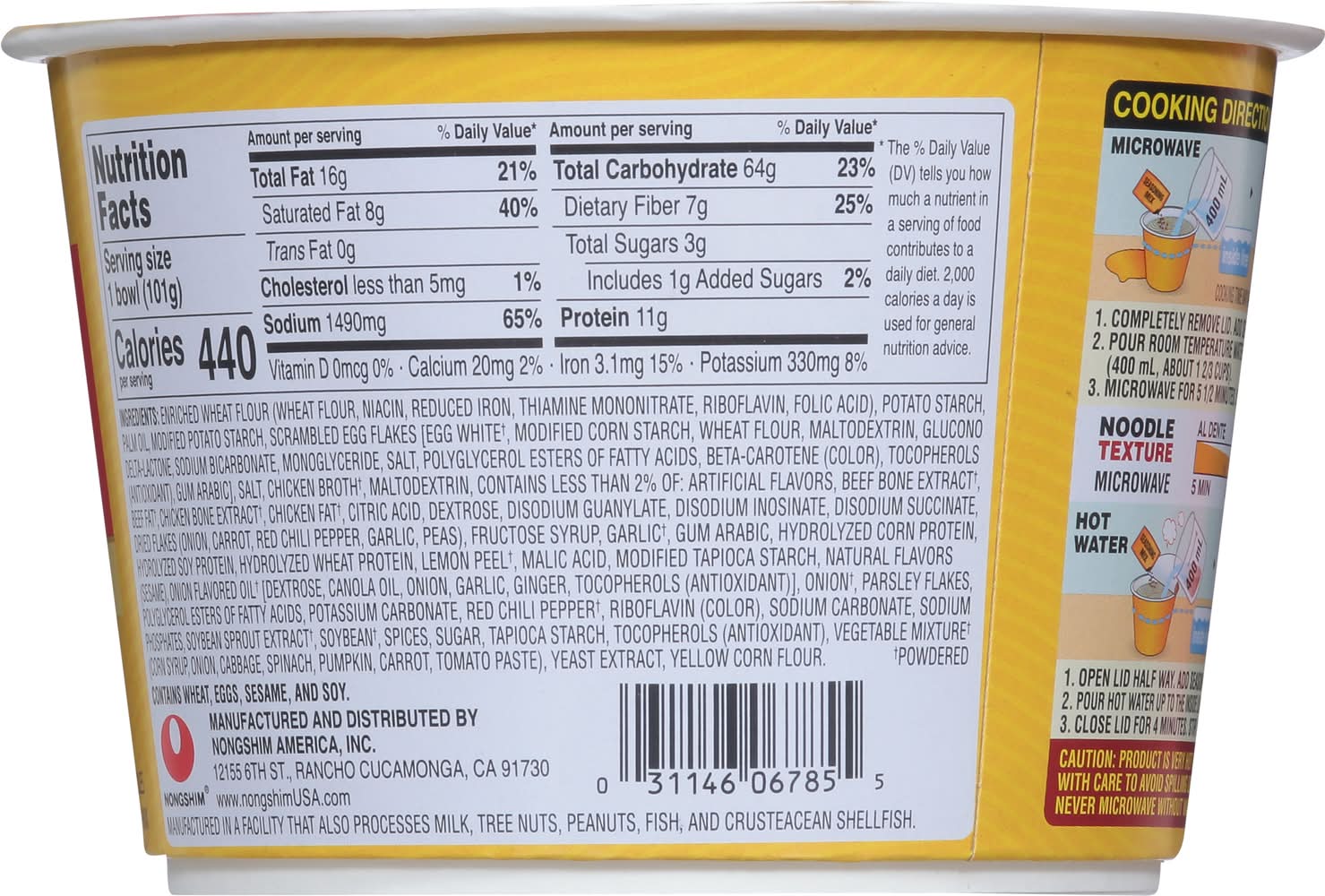 Ingredients: Enriched Wheat Flour (Wheat Flour, Niacin, Reduced Iron, Thiamine Mononitrate, Riboflavin, Folic Acid), Potato Starch, Palm Oil, Modified Potato Starch, Scrambled Egg Flakes [Egg White (Powered), Modified Corn Starch, Wheat Flour, Maltodextrin, Glucono Delta-Lactone, Sodium Bicarbonate, Monoglyceride, Salt, Polyglycerol Esters of Fatty Acids, Beta-Carotene (Color), Tocopherols (Antioxidant), Gum Arabic], Salt, Chicken Broth (Powered), Maltodextrin, Contains Less than 2% of: Artificial Flavors, Beef Bone Extract (Powered), Beef Fat (Powered), Chicken Bone Extract (Powered), Chicken Fat (Powered), Citric Acid, Dextrose, Disodium Guanylate, Disodium Inosinate, Disodium Succinate, Dried Flakes (Onion, Carrot, Red Chili Pepper, Garlic, Peas), Fructose Syrup, Garlic (Powered), Gum Arabic, Hydrolyzed Corn Protein, Hydrolyzed Soy Protein, Hydrolyzed Wheat Protein, Lemon Peel (Powered), Malic Acid, Modified Tapioca Starch, Natural Flavors (Sesame), Onion Flavored Oil (Powered) [Dextrose, Canola Oil, Onion, Garlic, Ginger, Tocopherols (Antioxidant)], Onion (Powered), Parsley Flakes, Polyglycerol Esters of Fatty Acids, Potassium Carbonate, Red Chili Pepper (Powered), Riboflavin (Color), Sodium Carbonate, Sodium Phosphates, Soybean Sprout Extract (Powered), Soybean (Powered), Spices, Sugar, Tapioca Starch, Tocopherols (Antioxidant), Vegetable Mixture (Powered), (Corn Syrup, Onion, Cabbage, Spinach, Pumpkin, Carrot, Tomato Pasta), Yeast Extract, Yellow Corn Flour Contains: Wheat, Eggs, Sesame, Soybeans, Corn, Milk, Tree Nuts, Peanuts, Crustacean Shellfish, Molluscan Shellfish, Fish