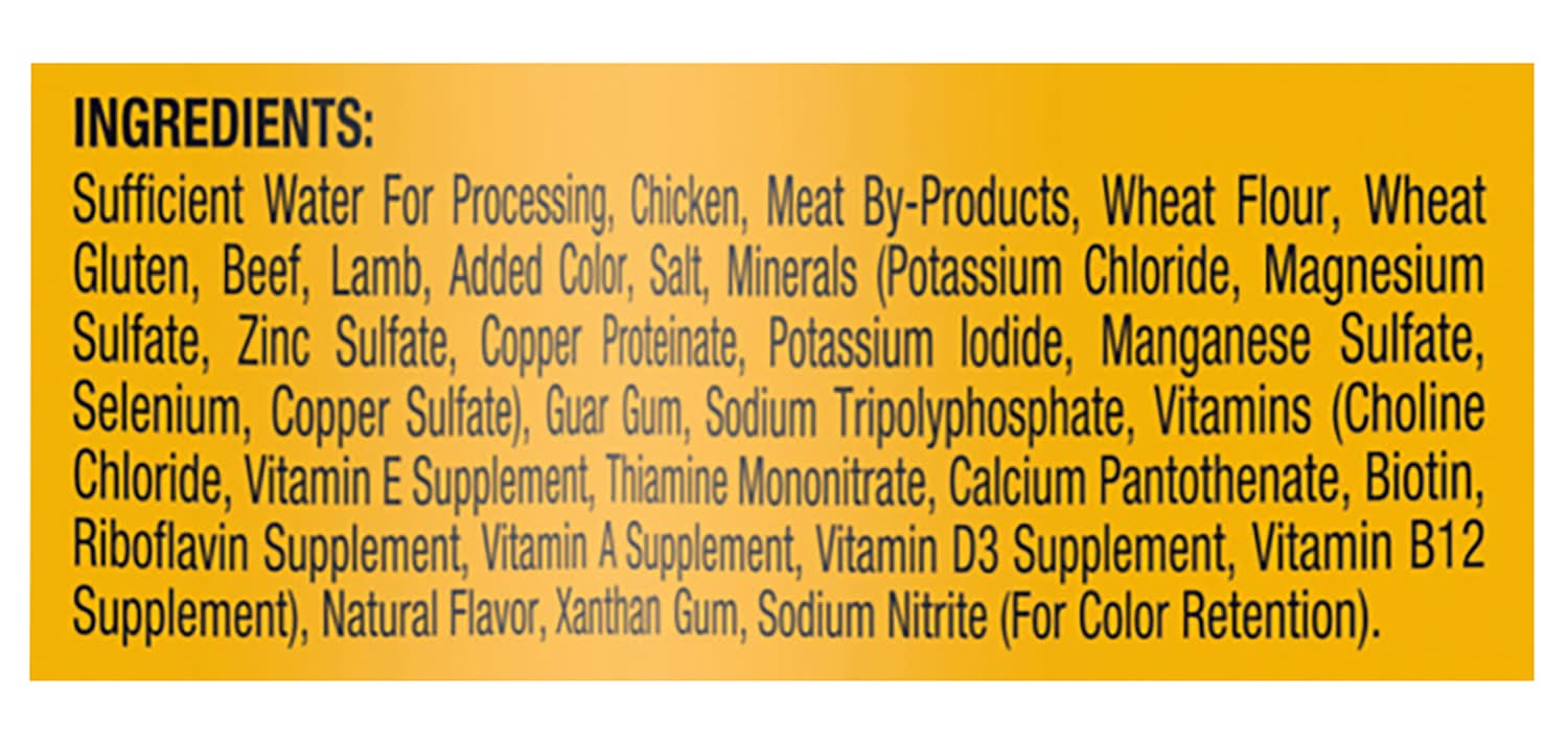 Ingredients: Sufficient Water for Processing, Chicken, Meat By-Products, Wheat Flour, Wheat Gluten, Beef, Lamb, Added Color, Salt, Minerals (Potassium Chloride, Magnesium Sulfate, Zinc Sulfate, Copper Proteinate, Potassium Iodide, Manganese Sulfate, Selenium, Copper Sulfate), Guar Gum, Sodium Tripolyphosphate, Vitamins (Choline Chloride, Vitamin E Supplement, Thiamine Mononitrate, Calcium Pantothenate, Biotin, Riboflavin Supplement, Vitamin A Supplement, Vitamin D3 Supplement, Vitamin B12 Supplement), Natural Flavor, Xanthan Gum, Sodium Nitrite (for Color Retention) Contains: 'Contains Wheat', 'Contains Gluten'