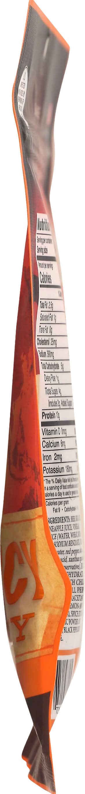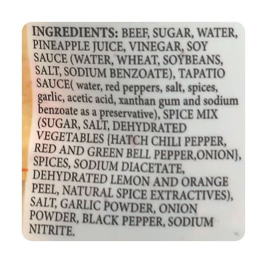 Ingredients: Beef, Sugar, Water, Pineapple Juice, Vinegar, Soy Sauce (Water, Wheat, Soybeans, Salt, Sodium Benzoate), Tapatio Sauce (Water, Red Peppers, Salt, Spices, Garlic, Acetic Acid, Xanthan Gum and Sodium Benzoate as a Preservative), Spice Mix (Sugar, Salt, Dehydrated Vegetables (Hatch Chili Pepper, Red and Green Bell Pepper, Onion), Spices, Sodium Diacetate, Dehydrated Lemon and Orange Peel, Natural Spice Extractives), Salt, Garlic Powder, Onion Powder, Black Pepper, Sodium Nitrite Contains: Soybeans, Wheat