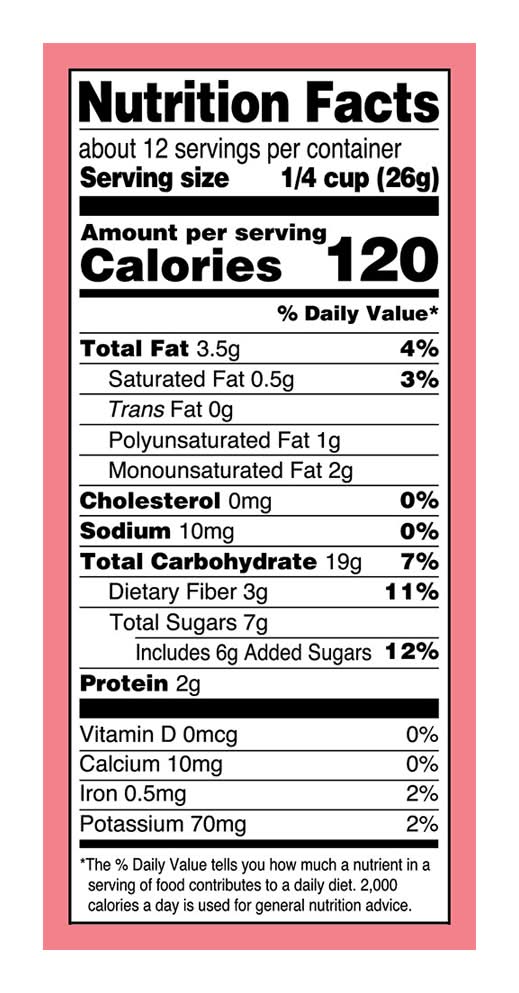 Ingredients: Whole Grain Rolled Oats, Brown Sugar, Sweetened Dried Cranberries (Cranberries, Sugar, Glycerin, Sunflower Oil), Brown Rice Crisp (Whole Grain Brown Rice Flour, Brown Rice Syrup, Sea Salt), Oat Fiber, Pecans, Safflower Oil, Chicory Root Fiber, Contains 2% or Less than of Almonds, Brown Rice Syrup, Dried Coconut, Natural Flavor, Mixed Tocopherols (for Freshness) Contains: Tree Nuts, Almonds, Tree Nuts, Coconuts, Tree Nuts, Pecans, Oat, Peanuts, Milk, Tree Nuts, Walnuts/Butternuts, Tree Nuts, Cashews, Soybeans