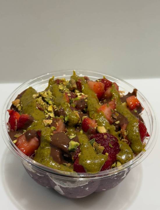 Acai bowl with Dubai chocolate, kanaffe, crumbled pistachios, pistachio creme, and fresh strawberries.