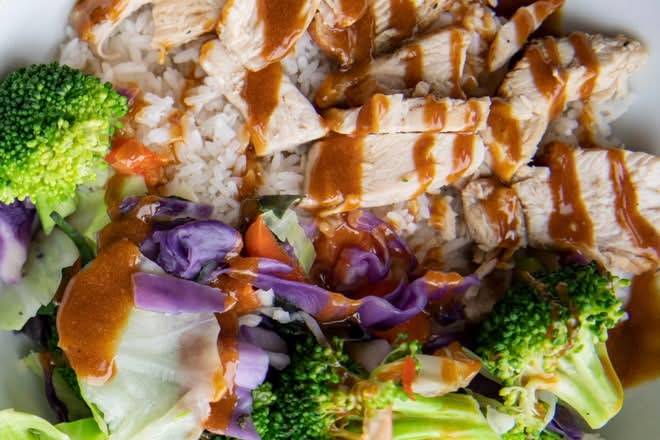 Steamed mixed veggies, gluten-free thai peanut sauce, and your choice of side.