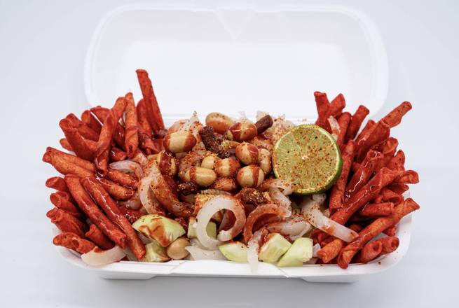 Pork rind, cucumber, jicama, chamoy, peanuts, tamarind candy, Valentina, and lime.