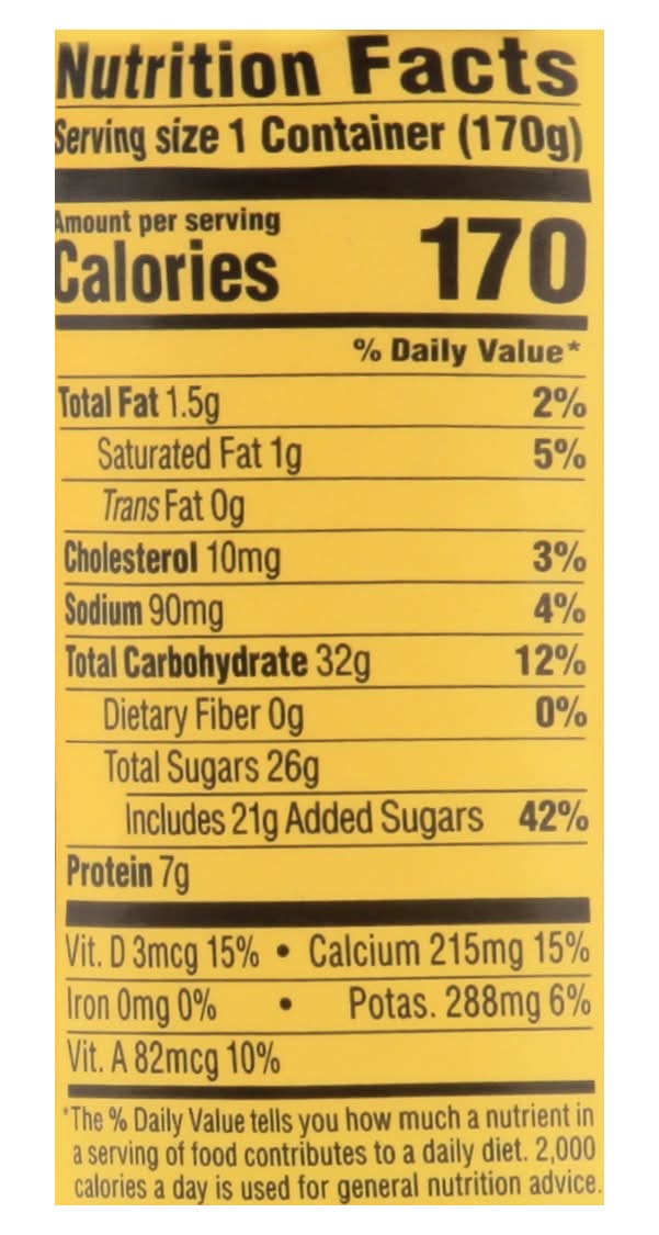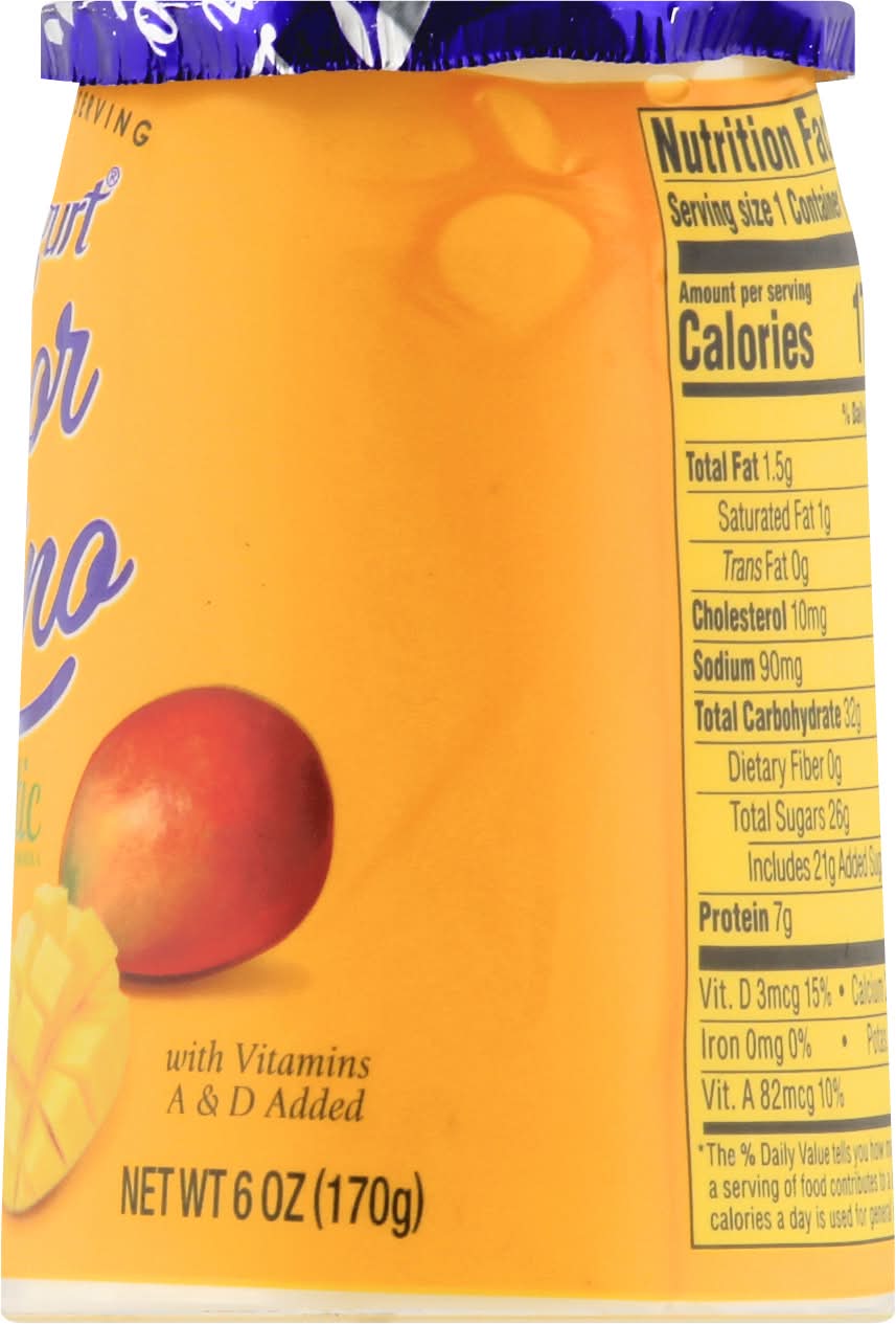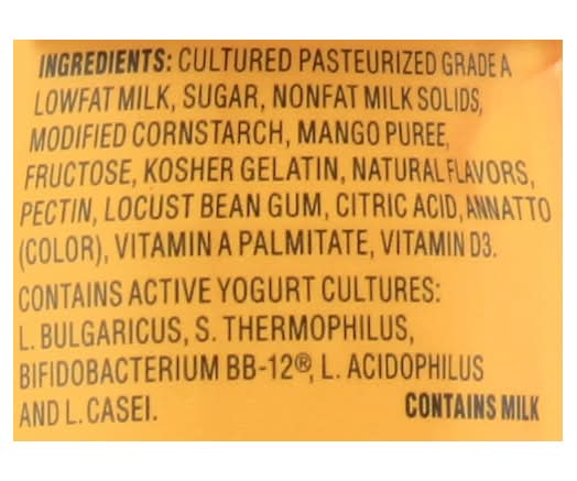 Ingredients: Cultured Pasteurized Grade A Lowfat Milk, Sugar, Nonfat Milk Solids, Modified Cornstarch, Mango Puree, Fructose, Kosher Gelatin, Natural Flavors, Pectin, Locust Bean Gum, Citric Acid, Annatto (Color), Vitamin A Palmitate, Vitamin D3, Contains Active Yogurt Cultures: L. Bulgaricus, S. Thermophilus, Bifidobacterium Bb-12, L. Acidophilus and L. Casei Contains: Milk