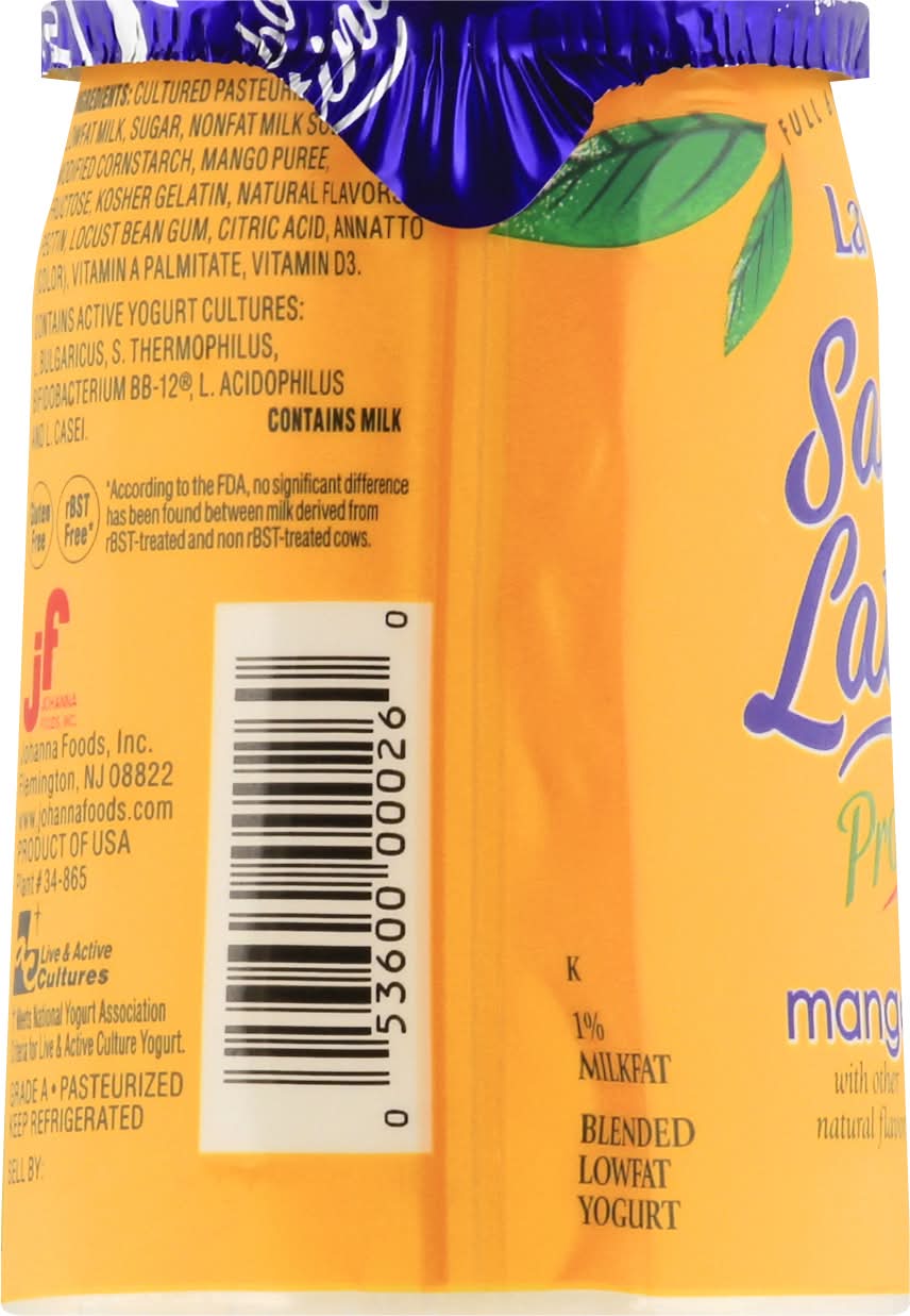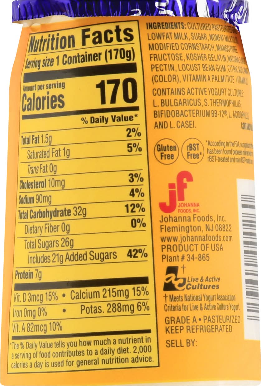 Full 6 oz serving. Mango with other natural flavors. Gluten free. 1% milkfat. With vitamins A & D added. Probiotic formula. rBST free (According to the FDA, no significant difference has been found between milk derived from rBST-treated and non rBST-treated cows.) Live & Active Cultures (Meets National Yogurt Association Criteria for Live & Active Culture Yogurt). Pasteurized. Grade A. www.johannafoods.com. Product of USA. • Flavor: Mango • Size: 6 OZ • Johanna Foods Inc., Flemington NJ 08822 • Packaging: Reusable