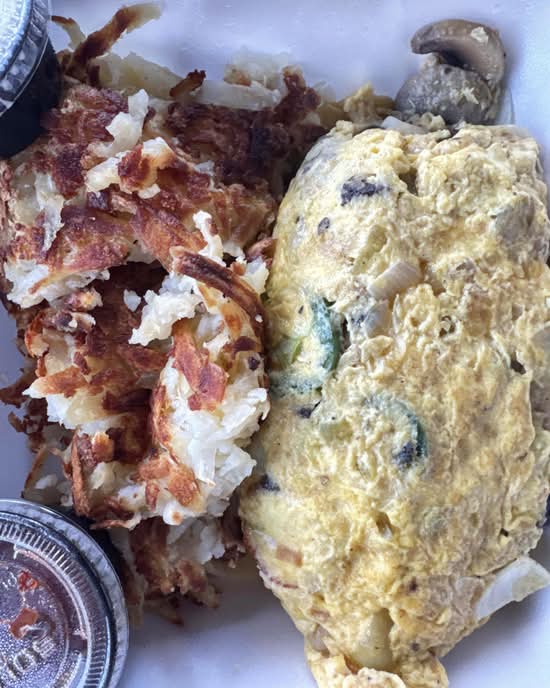 Steak, onions, fresh jalapenos, tomatoes, mushrooms, and pepper. Served with hash browns or fruit. Served with your choice of toast, pancakes, and French toast.