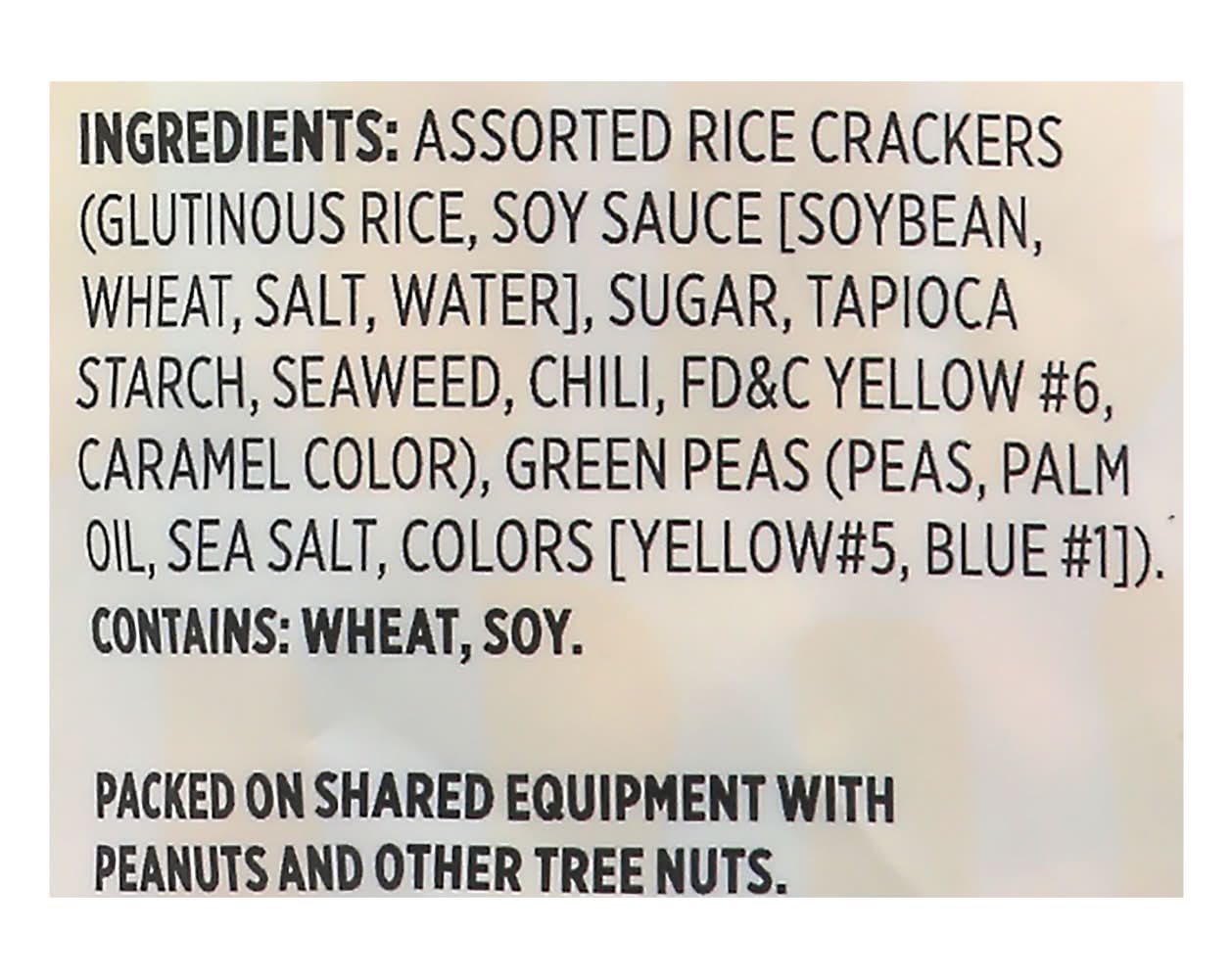 Ingredients: Assorted Rice Crackers (Glutinous Rice, Soy Sauce [Soybean, Wheat, Salt, Water], Sugar, Tapioca Starch, Seaweed, Chili, FD&C Yellow 6, Caramel Color), Green Peas (Peas, Palm Oil, Sea Salt, Colors [Yellow 5, Blue 1]) Contains: Wheat, Soybeans, Peanuts, Tree Nuts