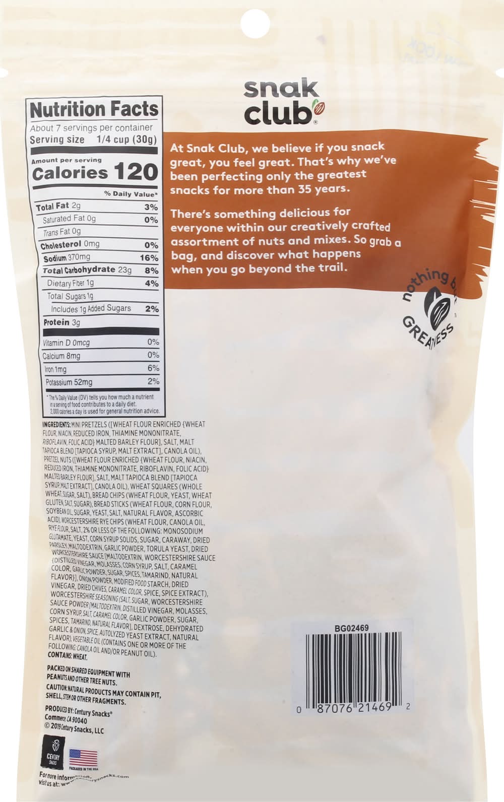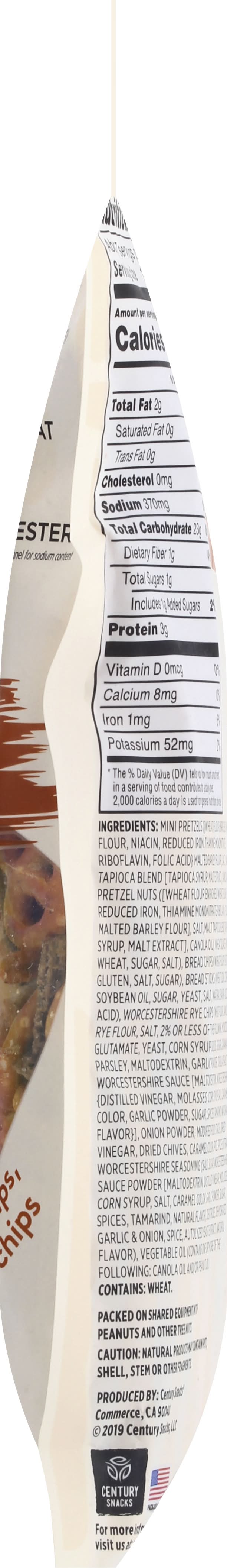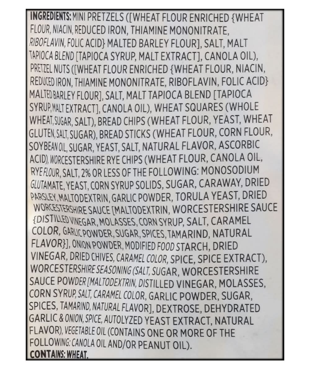 Ingredients: Mini Pretzels ([Wheat Flour Enriched {Wheat Flour, Niacin, Reduced Iron, Thiamine Mononitrate, Riboflavin, Folic Acid}, Malted Barley Flour], Salt, Malt Tapioca Blend [Tapioca Syrup, Malt Extract], Canola Oil), Pretzel Nuts ([Wheat Flour Enriched {Wheat Flour, Niacin, Reduced Iron, Thiamine Mononitrate, Riboflavin, Folic Acid} Malted Barley Flour], Salt, Malt Tapioca Blend [Tapioca Syrup, Malt Extract], Canola Oil), Wheat Squares (Whole Wheat Sugar, Salt), Bread Chips (Wheat Flour, Yeast, Wheat Gluten, Salt, Sugar), Bread Sticks (Wheat Flour, Corn Flour, Soybean Oil, Sugar, Yeast, Salt, Natural Flavor, Ascorbic Acid), Worcestershire Rye Chips (Wheat Flour, Canola Oil, Rye Flour, Salt, 2% or Less of the Following: Monosodium Glutamate, Yeast, Corn Syrup Solids, Sugar, Caraway, Dried Parsley Maltodextrin, Garlic Powder, Torula Yeast, Dried Worcestershire Sauce [Maltodextrin, Worcestershire Sauce {Distilled Vinegar, Molasses, Corn Syrup, Salt, Caramel Color, Garlic Powder, Sugar, Spices, Tamarind, Natural Flavor}], Onion Powder, Modified Food Starch, Dried Vinegar, Dried Chives, Caramel Color, Spice, Spice Extract), Worcestershire Seasoning (Salt, Sugar, Worcestershire Sauce Powder [Maltodextrin, Distilled Vinegar, Molasses, Corn Syrup, Salt, Caramel Color, Garlic Powder, Sugar, Spices, Tamarind, Natural Flavor], Dextrose, Dehydrated Garlic & Onion, Spice, Autolyzed Yeast Extract, Natural Flavor), Vegetable Oil (Contains One or More of the Following: Canola Oil and/or Peanut Oil) Contains: Wheat, Gluten, Peanuts, Peanuts, Tree Nuts