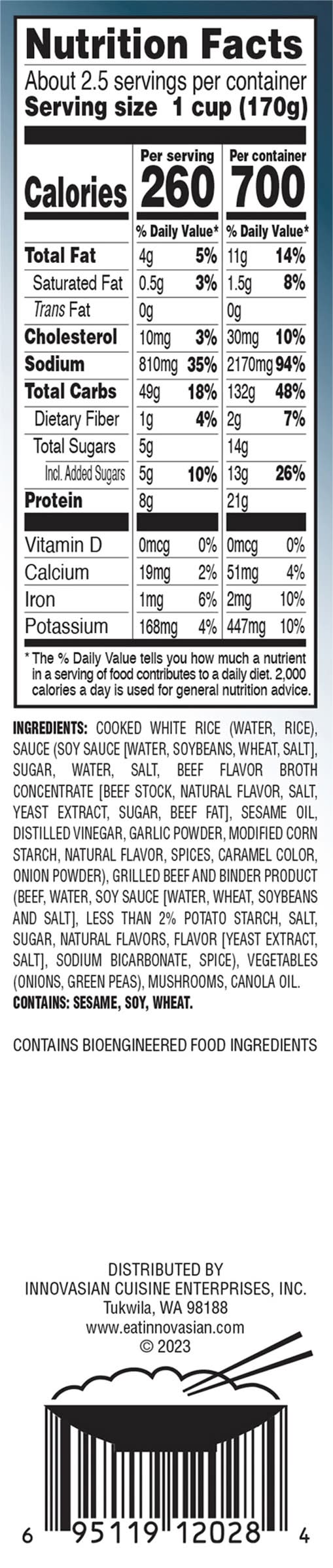 Ingredients: Cooked White Rice (Water, Rice), Sauce (Soy Sauce [Water, Soybeans, Wheat, Salt], Sugar, Water, Salt, Beef Flavor Broth Concentrate [Beef Stock, Natural Flavor, Salt, Yeast Extract, Sugar, Beef Fat], Sesame Oil, Distilled Vinegar, Garlic Powder, Modified Corn Starch, Natural Flavor, Spices, Caramel Color, Onion Powder), Grilled Beef and Binder Product (Beef, Water, Soy Sauce [Water, Wheat, Soybeans and Salt], Less than 2% Potato Starch, Salt, Sugar, Natural Flavors, Flavor [Yeast Extract, Salt], Sodium Bicarbonate, Spice), Vegetables (Onions, Green Peas), Mushrooms, Canola Oil Contains: Sesame, Soybeans, Wheat